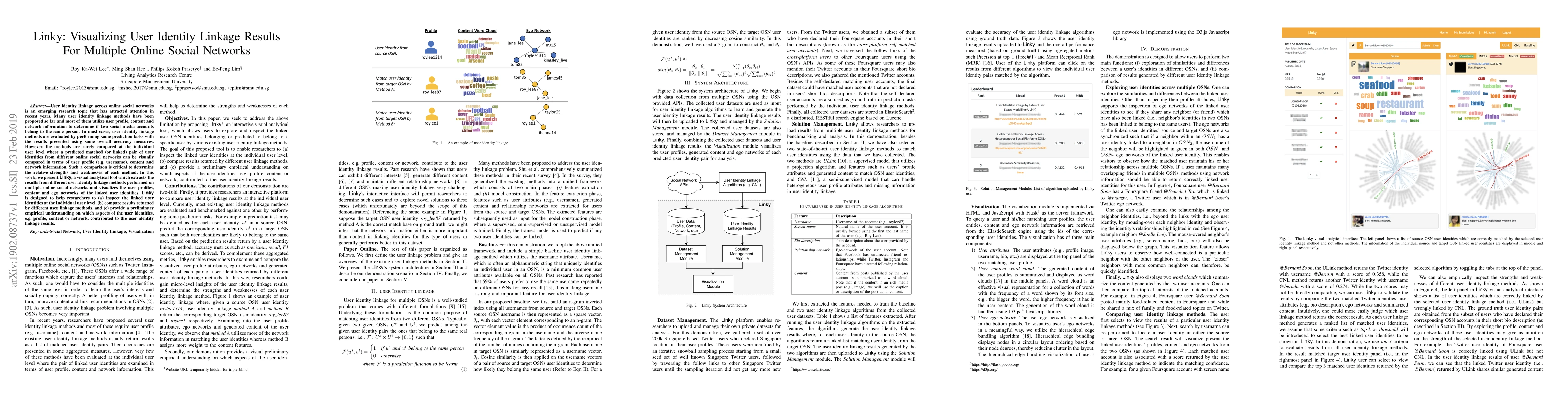 Linky is a visual analytical tool designed to inspect and compare user identity linkage results across multiple online social networks, focusing on individual user-level analysis. It helps researchers evaluate the strengths and weaknesses of different linkage methods by visualizing user profiles, content, and network information.