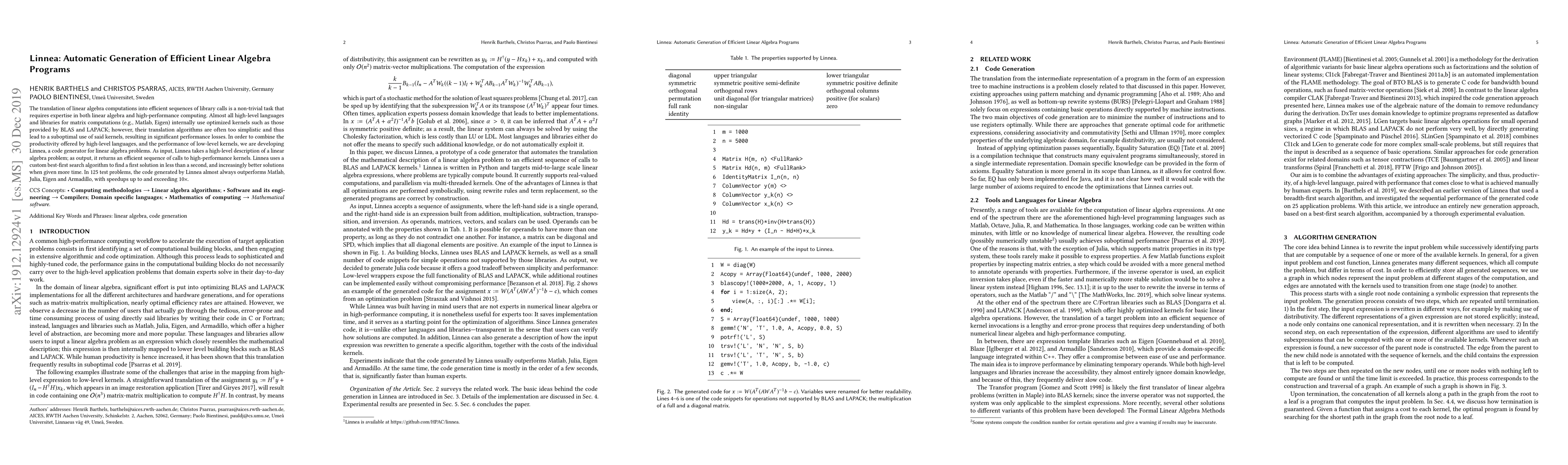 Linnea is a code generator designed to automatically produce efficient linear algebra programs from high-level descriptions, outperforming traditional libraries like Matlab and Eigen by leveraging optimized low-level kernels. It employs a best-first search algorithm to achieve significant performance gains, often exceeding 10x in speed.