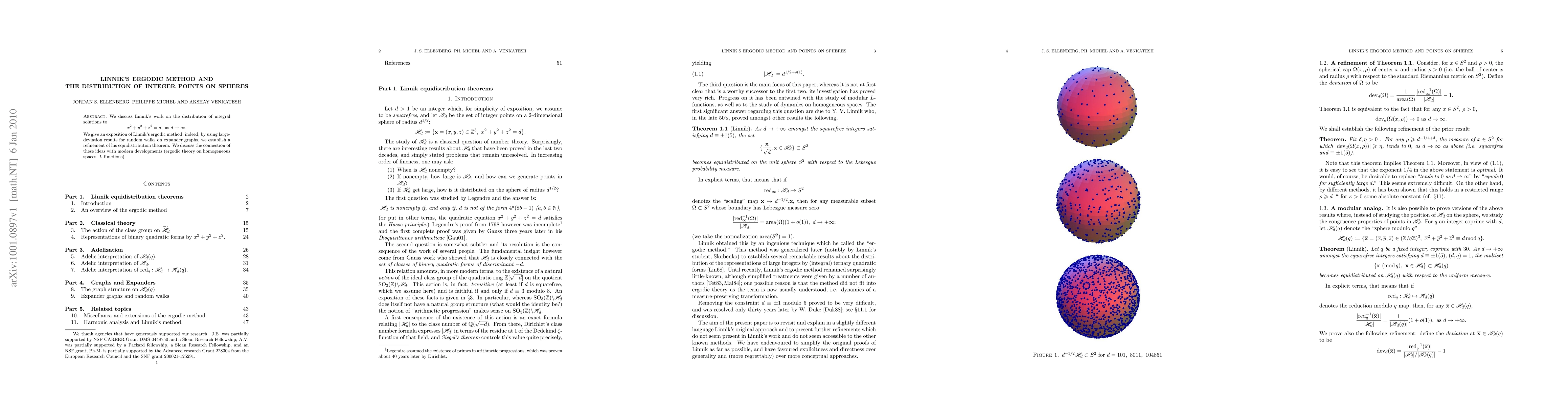 This paper discusses Linnik's ergodic method for analyzing the distribution of integral solutions to x^2+y^2+z^2=d as d grows. It presents a refined equidistribution theorem using large-deviation results for random walks on expander graphs. The work also connects these ideas to contemporary ergodic theory on homogeneous spaces and L-functions.