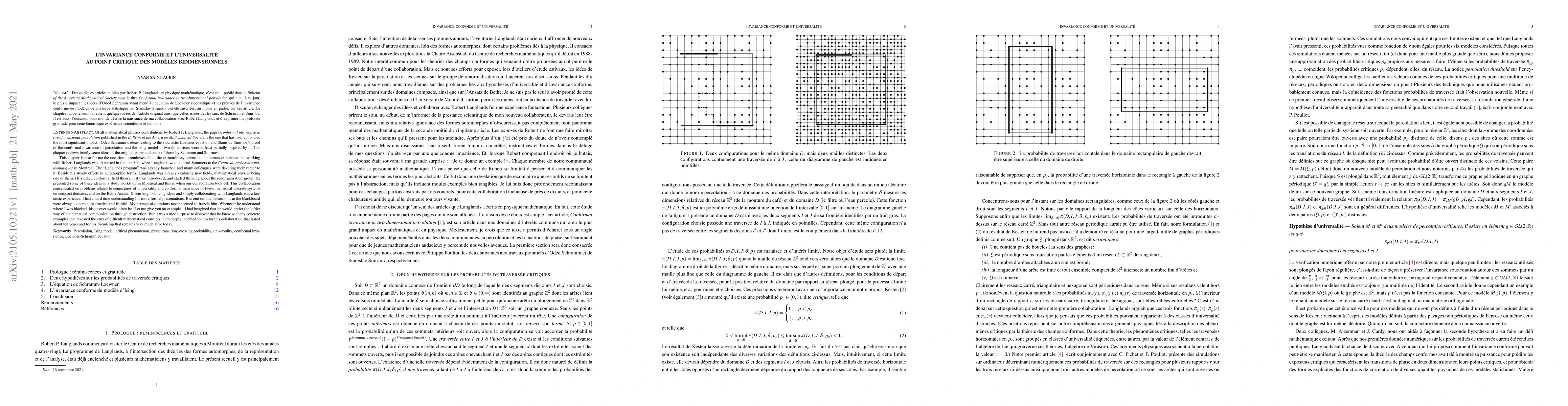 R\'esum\'e. Des quelques articles publi\'es par Robert P. Langlands en physique math\'ematique, c'est celui publi\'e dans le {\it Bulletin of the American Mathematical Society} sous le titre {\it Conformal invariance in two-dimensional percolation} qui a eu, \`a ce jour, le plus d'impact : les id\'ees d'Oded Schramm ayant men\'e \`a l'\'equation de Loewner stochastique et les preuves de l'invariance conforme de mod\`eles de physique statistique par Stanislav Smirnov ont \'et\'e suscit\'ees, au moins en partie, par cet article. Ce chapitre rappelle sommairement quelques id\'ees de l'article original ainsi que celles issues des travaux de Schramm et Smirnov. Il est aussi l'occasion pour moi de d\'ecrire la naissance de ma collaboration avec Robert Langlands et d'exprimer ma profonde gratitude pour cette fantastique exp\'erience scientifique et humaine. Abstract. Of all mathematical physics contributions by Robert P. Langlands, the paper {\it Conformal invariance in two-dimensional percolation} published in the {\it Bulletin of the American Mathematical Society} is the one that has had, up to now, the most significant impact: Oded Schramm's ideas leading to the stocastic Loewner equation and Stanislav Smirnov's proof in two dimensions were at least partially inspired by it. This chapter reviews briefly some ideas of the original paper and some of those by Schramm and Smirnov.