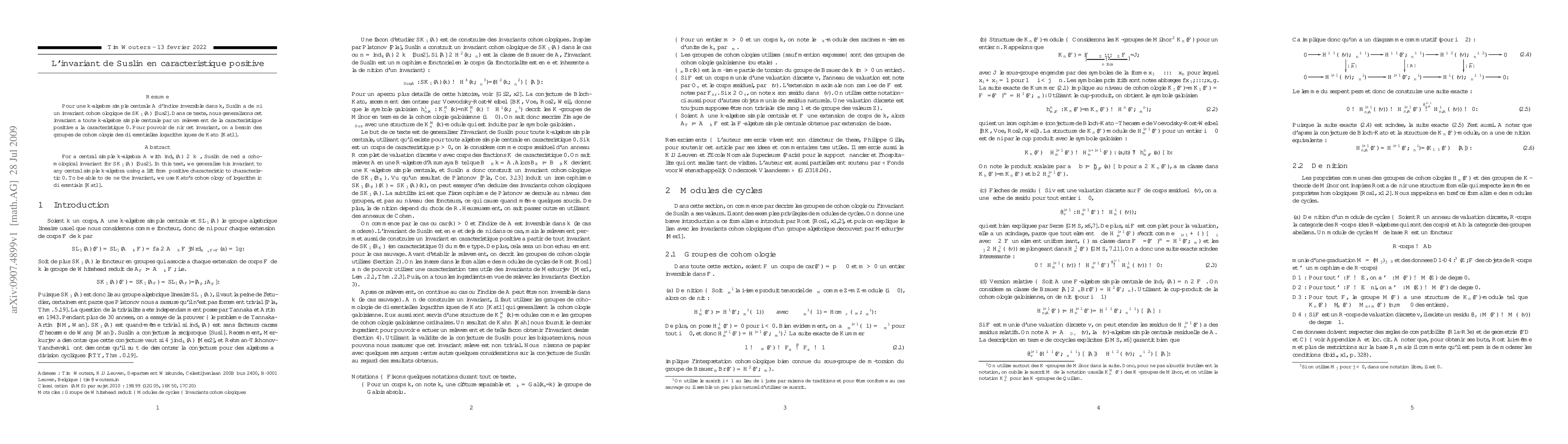Pour une k-alg\`ebre simple centrale A d'indice inversible dans k, Suslin a d\'efini un invariant cohomologique de SK_1(A). Dans ce texte, nous g\'en\'eralisons cet invariant \`a toute k-alg\`ebre simple centrale par un rel\`evement de la caract\'eristique positive \`a la caract\'eristique 0. Pour pouvoir d\'efinir cet invariant, on a besoin des groupes de cohomologie des diff\'erentielles logarithmiques de Kato. For a central simple k-algebra A with index invertible in k, Suslin defined a cohomological invariant for SK_1(A). In this text, we generalise his invariant to any central simple k-algebra using a lift from positive characteristic to characteristic 0. To be able to define the invariant, we use Kato's cohomology of logarithmic differentials.