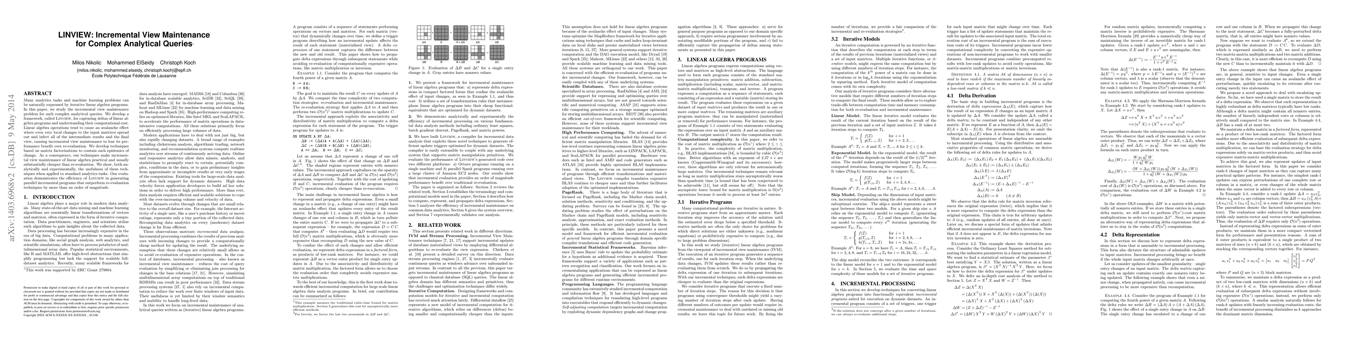 LINVIEW is a framework designed for efficient incremental maintenance of complex analytical queries expressed as iterative linear algebra programs, using matrix factorizations to mitigate the "avalanche effect" of changes, and achieving substantial performance benefits over complete re-evaluation. Experimental results show that LINVIEW generates parallel incremental programs that outperform traditional re-evaluation methods by over an order of magnitude.
