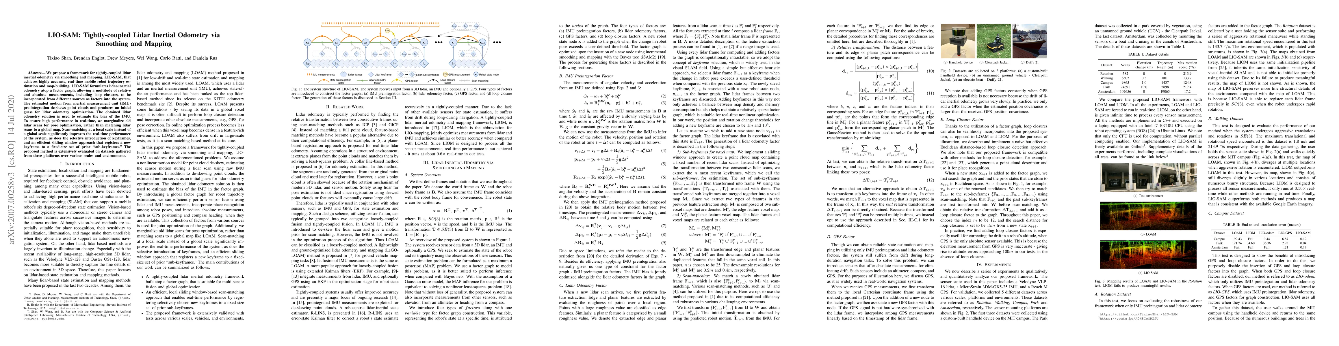 LIO-SAM is a tightly-coupled lidar-inertial odometry framework that uses smoothing and mapping to achieve real-time, highly accurate mobile robot trajectory estimation and map-building. It employs a factor graph to integrate various measurements and optimizes lidar odometry while marginalizing old scans for improved real-time performance.