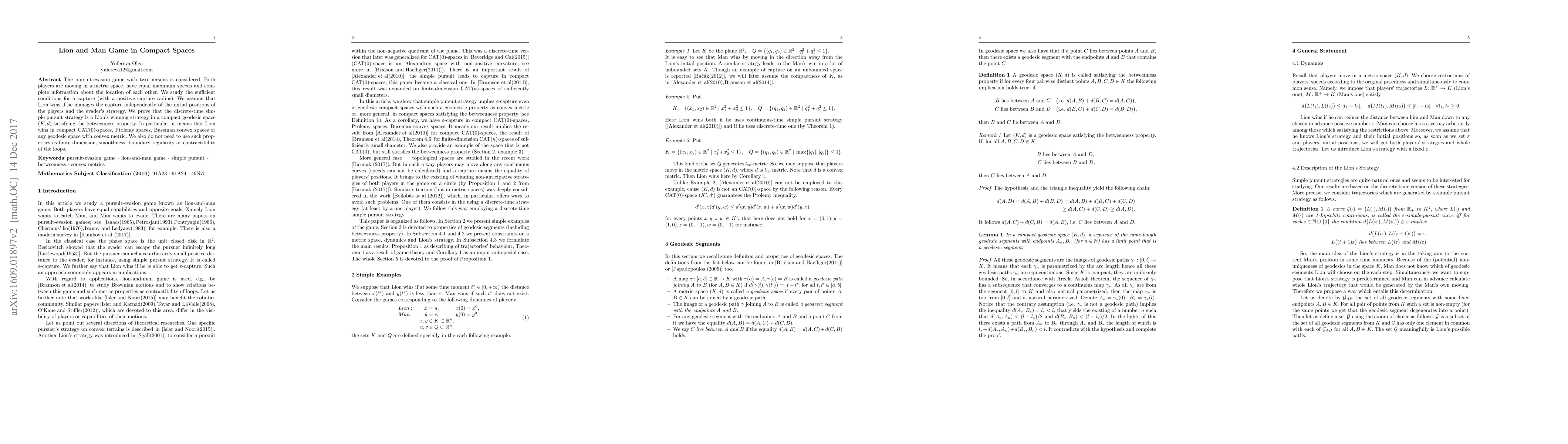 This research investigates a pursuit-evasion game in compact metric spaces where the Lion's goal is to capture the Man. The study proves that a discrete-time simple pursuit strategy guarantees Lion's victory in compact geodesic spaces that satisfy the betweenness property, including CAT(0)-spaces and Ptolemy spaces, without requiring finite dimension or boundary regularity.