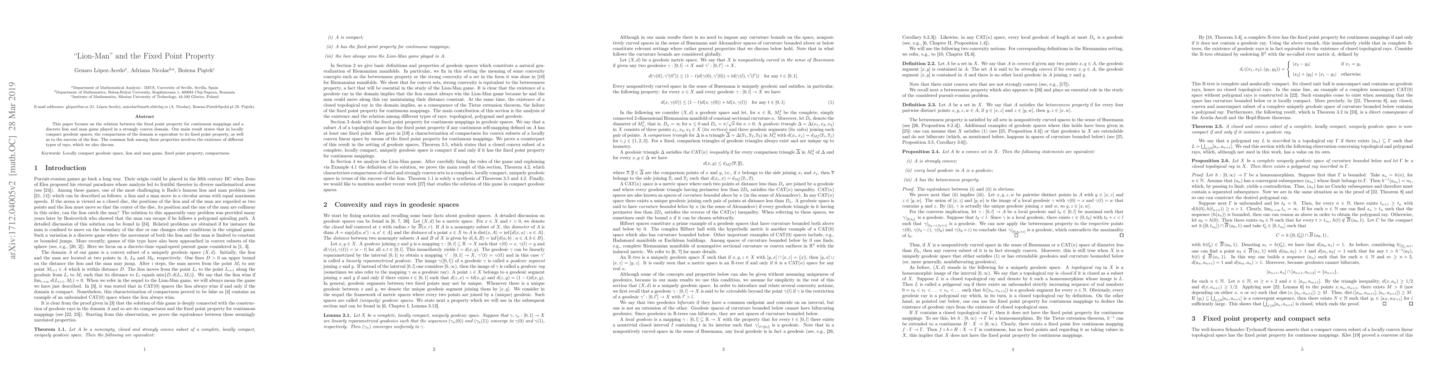 This paper explores the connection between the fixed point property of continuous mappings and a discrete lion and man game within a strongly convex domain. It concludes that in locally compact geodesic spaces, the compactness of the domain is equivalent to both the fixed point property and the lion's success, linking these via the existence of various types of rays.