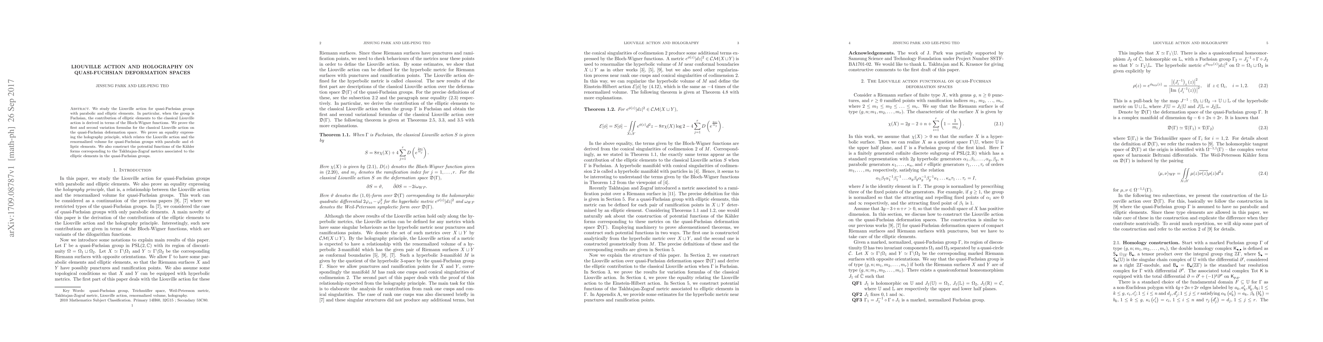 This paper investigates the Liouville action for quasi-Fuchsian groups, deriving the contribution of elliptic elements in terms of Bloch-Wigner functions and proving variation formulas for the classical Liouville action. It establishes a holography principle linking the Liouville action to the renormalized volume and constructs potential functions for Kähler forms associated with Takhtajan-Zograf metrics.