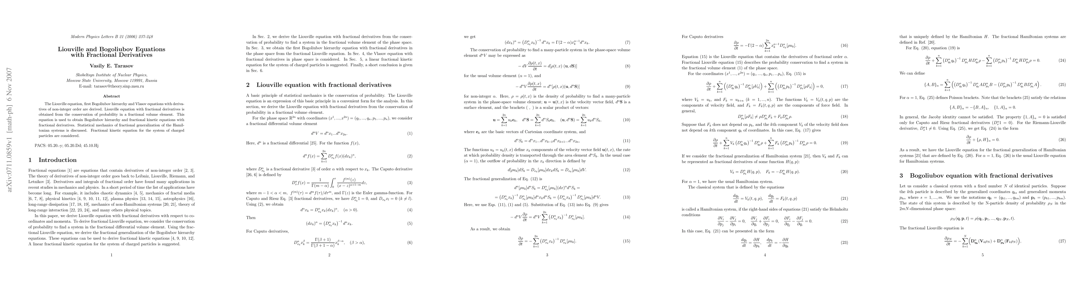 This paper derives the Liouville equation, Bogoliubov hierarchy, and Vlasov equations incorporating fractional derivatives, establishing a fractional kinetic equation for charged particles. It explores the statistical mechanics of fractional Hamiltonian systems and the conservation of probability in fractional volume elements.