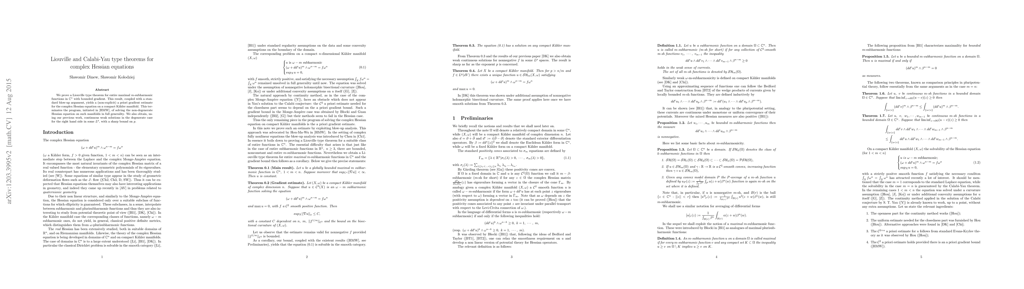 We prove a Liouville type theorem for entire maximal $m$-subharmonic functions in $\mathbb C^n$ with bounded gradient. This result, coupled with a standard blow-up argument, yields a (non-explicit) a priori gradient estimate for the complex Hessian equation on a compact K\"ahler manifold. This terminates the program, initiated by Hou, Ma and Wu, of solving the non-degenerate Hessian equation on such manifolds in full generality. We also obtain, using our previous work, continuous weak solutions in the degenerate case for the right hand side in some $L^p, $ with sharp bound on $p$.