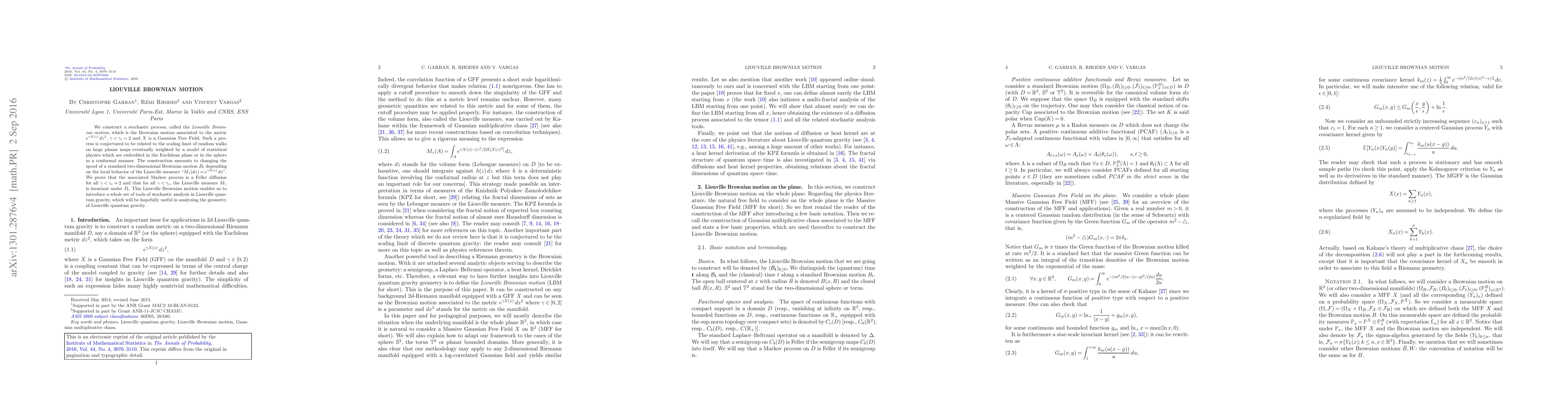 The paper constructs the Liouville Brownian motion, a stochastic process linked to the metric influenced by a Gaussian Free Field, and proves it is a Feller diffusion. This process is conjectured to connect to scaling limits of random walks on conformally embedded planar maps, potentially aiding in the analysis of Liouville quantum gravity.