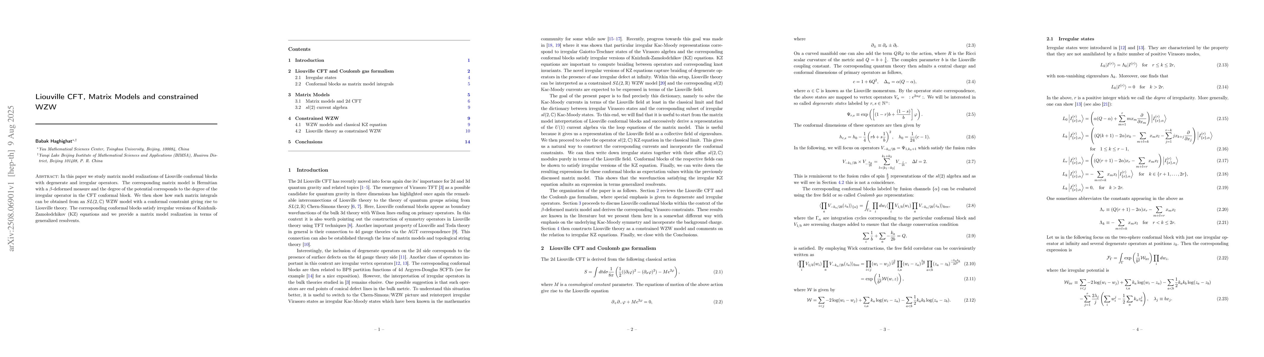 In this paper we study matrix model realizations of Liouville conformal blocks with degenerate and irregular operators. The corresponding matrix model is Hermitian with a $\beta$-deformed measure and the degree of the potential corresponds to the degree of the irregular operator in the CFT conformal block. We then show how such matrix integrals can be obtained from an $SL(2,\mathbb{C})$ WZW model with a conformal constraint giving rise to Liouville theory. The corresponding conformal blocks satisfy irregular versions of Knizhnik-Zamolodchikov (KZ) equations and we provide a matrix model realization in terms of generalized resolvents.