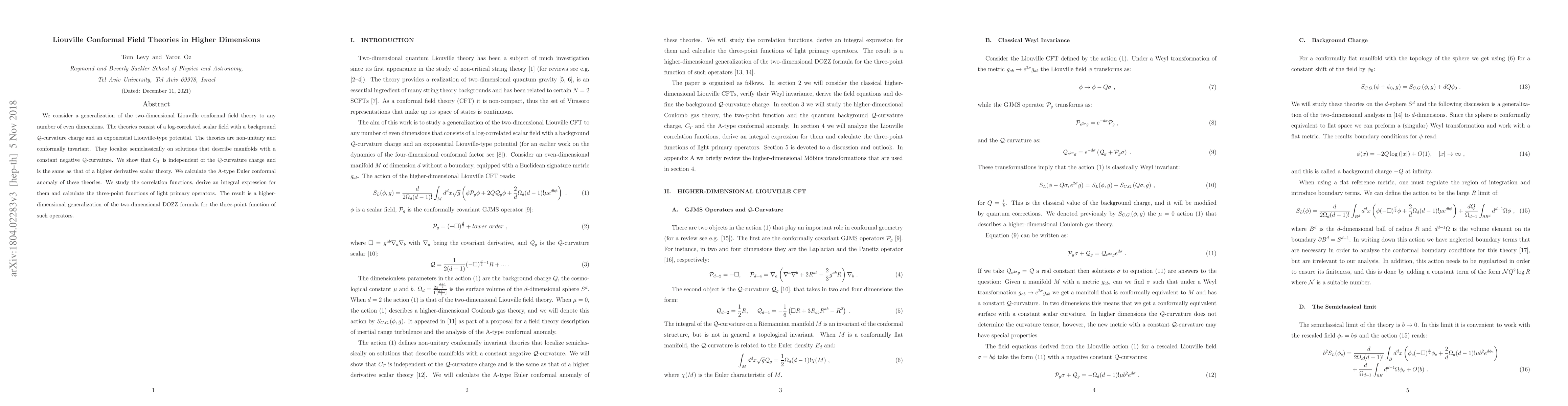 This paper generalizes two-dimensional Liouville conformal field theories to even higher dimensions, exploring non-unitary, conformally invariant theories characterized by a log-correlated scalar field and an exponential Liouville potential. It calculates the A-type Euler conformal anomaly and derives an integral expression for correlation functions, establishing a higher-dimensional version of the DOZZ formula for three-point functions of light primary operators.