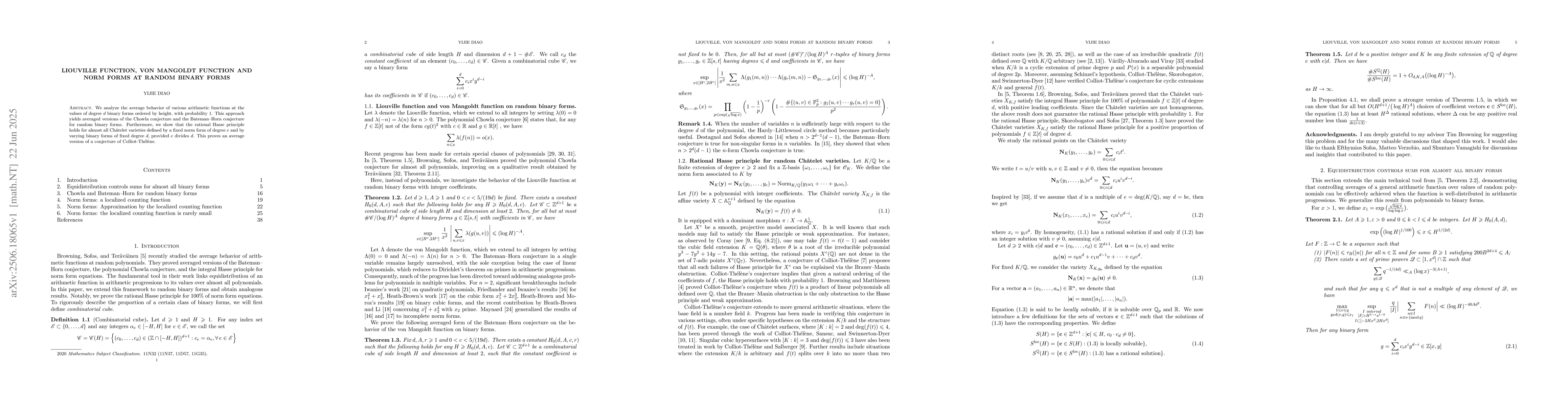 We analyze the average behavior of various arithmetic functions at the values of degree $d$ binary forms ordered by height, with probability $1$. This approach yields averaged versions of the Chowla conjecture and the Bateman-Horn conjecture for random binary forms. Furthermore, we show that the rational Hasse principle holds for almost all Ch\^atelet varieties defined by a fixed norm form of degree $e$ and by varying binary forms of fixed degree $d$, provided $e$ divides $d$. This proves an average version of a conjecture of Colliot-Th\'el\`ene.