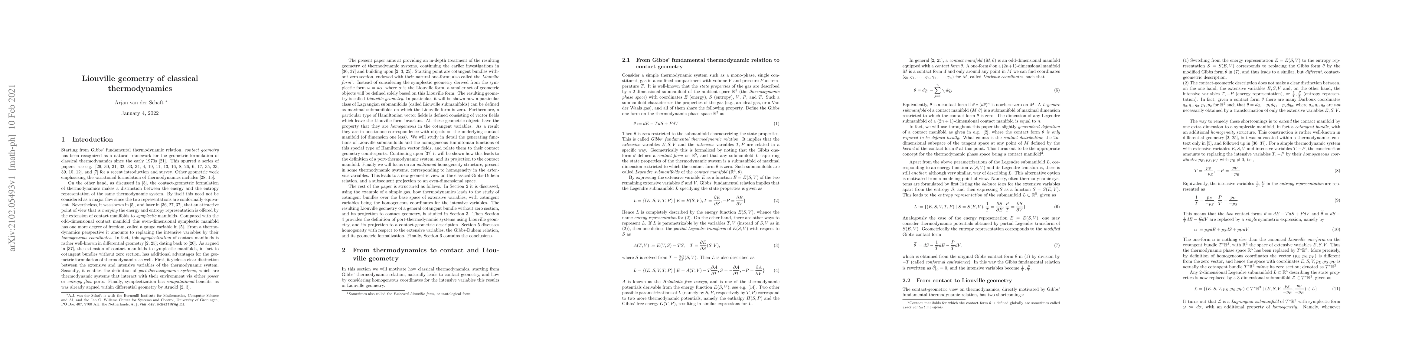 In the contact-geometric formulation of classical thermodynamics distinction is made between the energy and entropy representation, which can be resolved by taking homogeneous coordinates for the intensive variables. This results in a geometric formulation on the cotangent bundle of the manifold of extensive variables, where all geometric objects are homogeneous in the cotangent variables. The resulting geometry is studied in-depth. Additional homogeneity with respect to the extensive variables, corresponding to the classical Gibbs-Duhem relation, is treated within the same geometric framework.