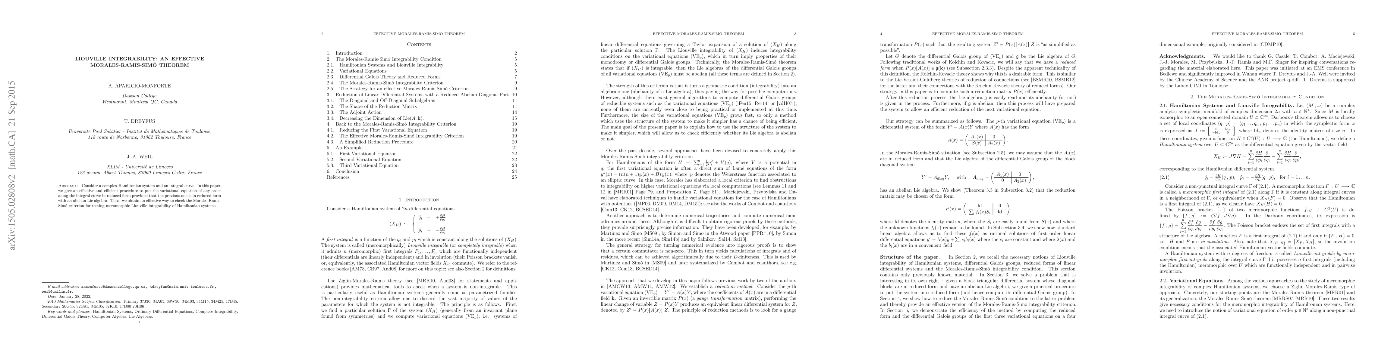 Consider a complex Hamiltonian system and an integral curve. In this paper, we give an effective and efficient procedure to put the variational equation of any order along the integral curve in reduced form provided that the previous one is in reduced form with an abelian Lie algebra. Thus, we obtain an effective way to check the Morales-Ramis-Sim\'o criterion for testing meromorphic Liouville integrability of Hamiltonian systems.