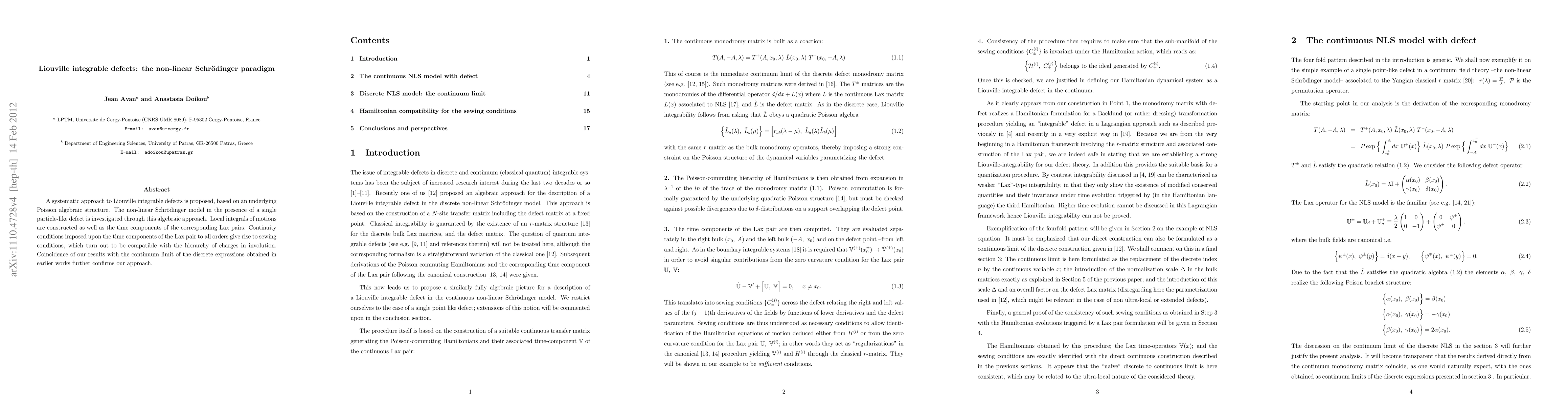 A systematic approach to Liouville integrable defects is proposed, based on an underlying Poisson algebraic structure. The non-linear Schrodinger model in the presence of a single particle-like defect is investigated through this algebraic approach. Local integrals of motions are constructed as well as the time components of the corresponding Lax pairs. Continuity conditions imposed upon the time components of the Lax pair to all orders give rise to sewing conditions, which turn out to be compatible with the hierarchy of charges in involution. Coincidence of our results with the continuum limit of the discrete expressions obtained in earlier works further confirms our approach.
