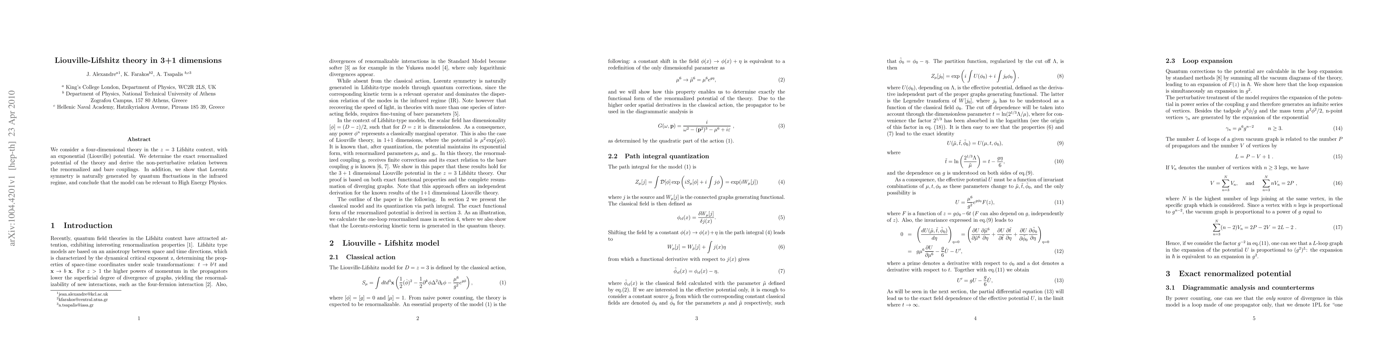 We consider a four-dimensional theory in the z=3 Lifshitz context, with an exponential (Liouville) potential. We determine the exact renormalized potential of the theory and derive the non-perturbative relation between the renormalized and bare couplings. In addition, we show that Lorentz symmetry is naturally generated by quantum fluctuations in the infrared regime, and conclude that the model can be relevant to High Energy Physics.