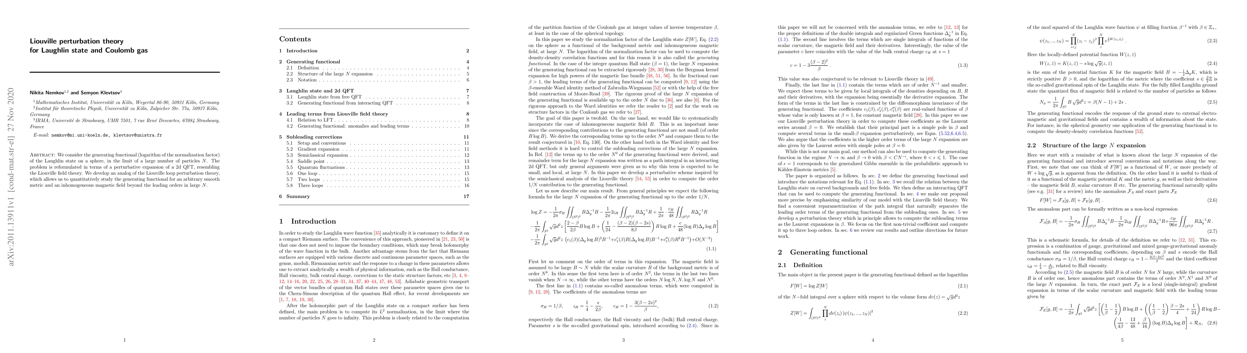 We consider the generating functional (logarithm of the normalization factor) of the Laughlin state on a sphere, in the limit of a large number of particles $N$. The problem is reformulated in terms of a perturbative expansion of a 2d QFT, resembling the Liouville field theory. We develop an analog of the Liouville loop perturbation theory, which allows us to quantitatively study the generating functional for an arbitrary smooth metric and an inhomogeneous magnetic field beyond the leading orders in large $N$.