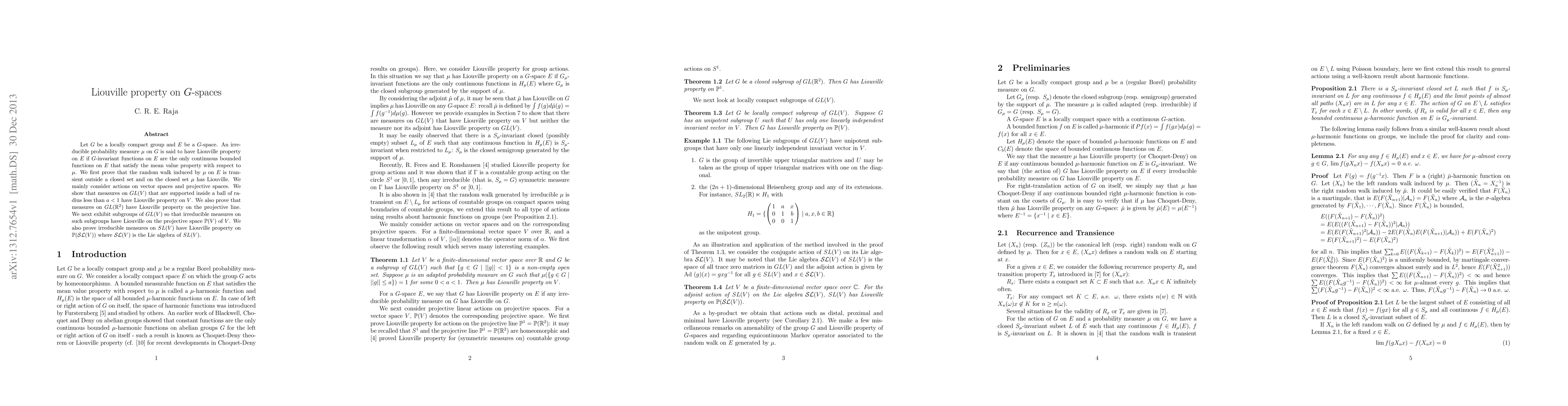 This paper investigates the Liouville property for measures on $G$-spaces, proving that certain random walks are transient and identifying conditions under which these measures exhibit the Liouville property, particularly in vector spaces and projective spaces. It demonstrates that measures confined to small balls in $GL(V)$ and $GL(\R^2)$ uphold the Liouville property on their respective projective spaces.