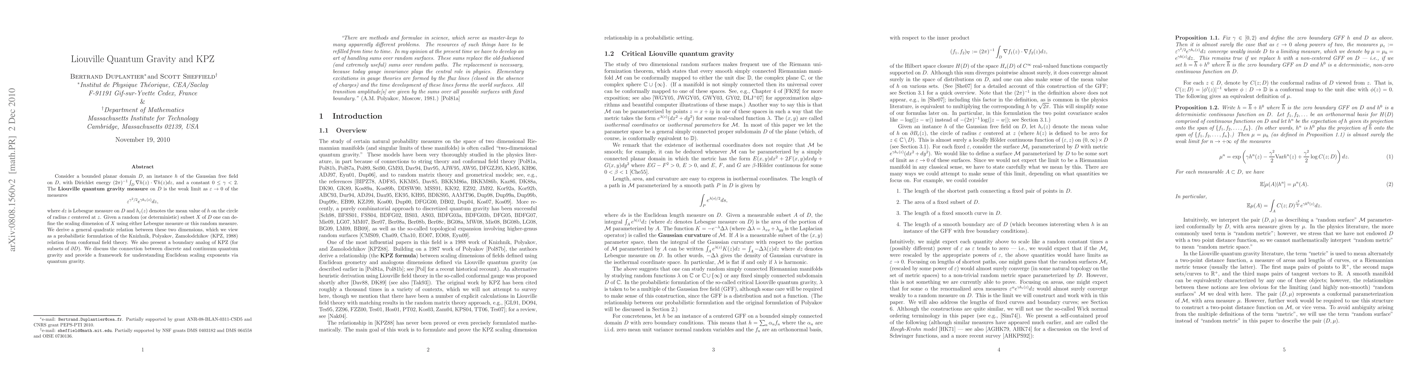 Consider a bounded planar domain D, an instance h of the Gaussian free field on D (with Dirichlet energy normalized by 1/(2\pi)), and a constant 0 < gamma < 2. The Liouville quantum gravity measure on D is the weak limit as epsilon tends to 0 of the measures \epsilon^{\gamma^2/2} e^{\gamma h_\epsilon(z)}dz, where dz is Lebesgue measure on D and h_\epsilon(z) denotes the mean value of h on the circle of radius epsilon centered at z. Given a random (or deterministic) subset X of D one can define the scaling dimension of X using either Lebesgue measure or this random measure. We derive a general quadratic relation between these two dimensions, which we view as a probabilistic formulation of the KPZ relation from conformal field theory. We also present a boundary analog of KPZ (for subsets of the boundary of D). We discuss the connection between discrete and continuum quantum gravity and provide a framework for understanding Euclidean scaling exponents via quantum gravity.
