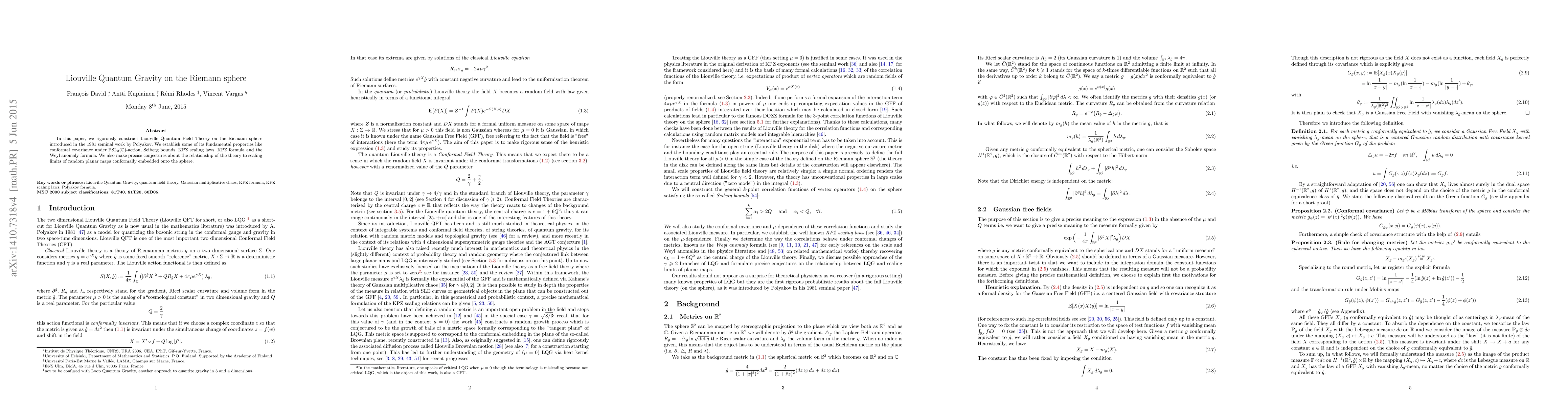 This paper rigorously constructs 2D Liouville Quantum Field Theory on the Riemann sphere, establishing its conformal covariance, Seiberg bounds, KPZ scaling laws, KPZ formula, and the Polyakov-Ray-Singer Weyl anomaly formula.