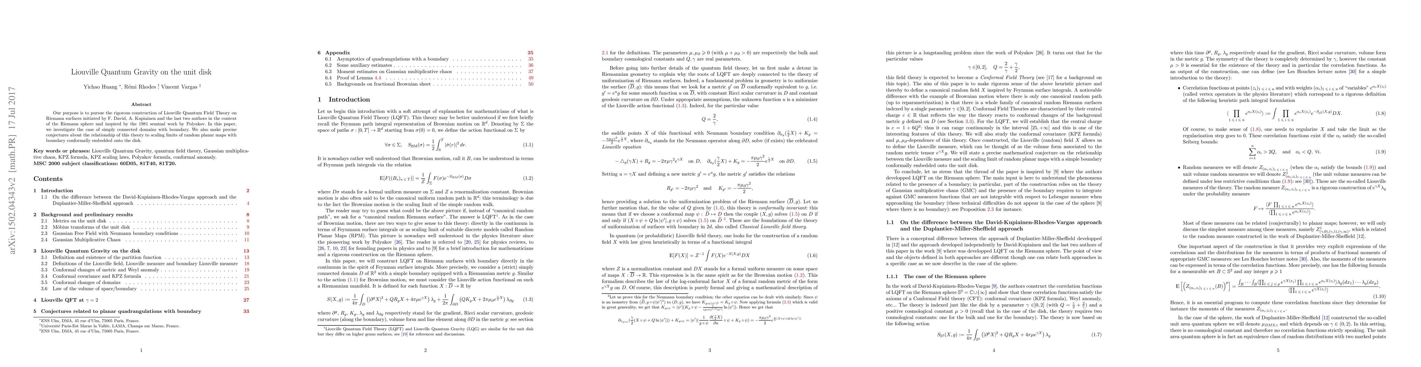 This paper rigorously constructs Liouville Quantum Field Theory on the unit disk, extending previous work on the Riemann sphere, and conjectures connections between this theory and scaling limits of random planar maps embedded onto the disk.