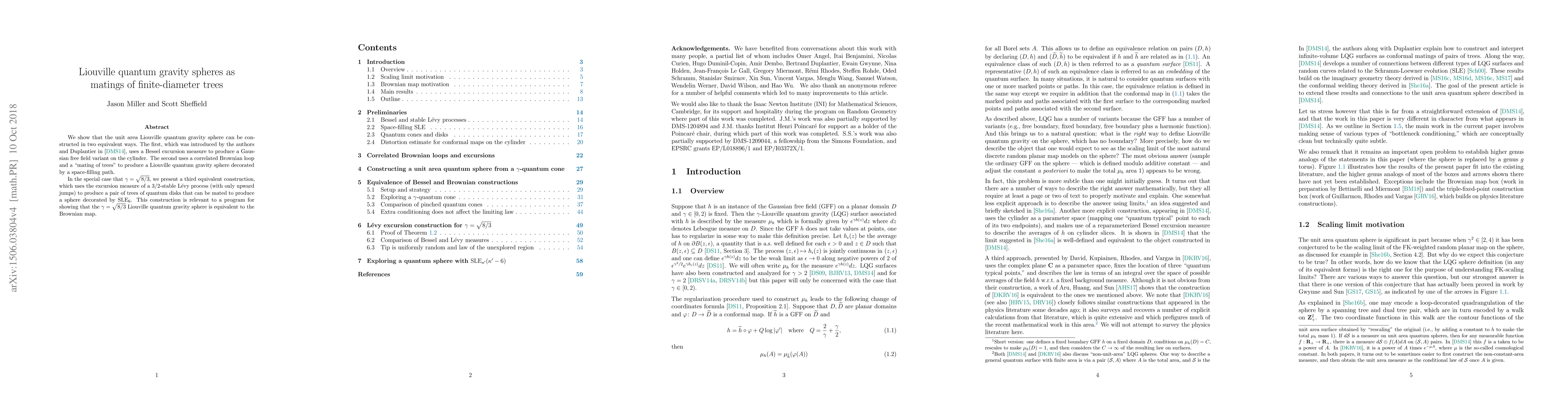 This paper demonstrates two equivalent constructions of the unit area Liouville quantum gravity sphere: one via a Bessel excursion measure and a Gaussian free field variant, and another through a correlated Brownian loop and a "mating of trees." For $\gamma=\sqrt{8/3}$, it introduces a third method using a $3/2$-stable L\'evy process to mate quantum disks, relevant to proving equivalence to the Brownian map.