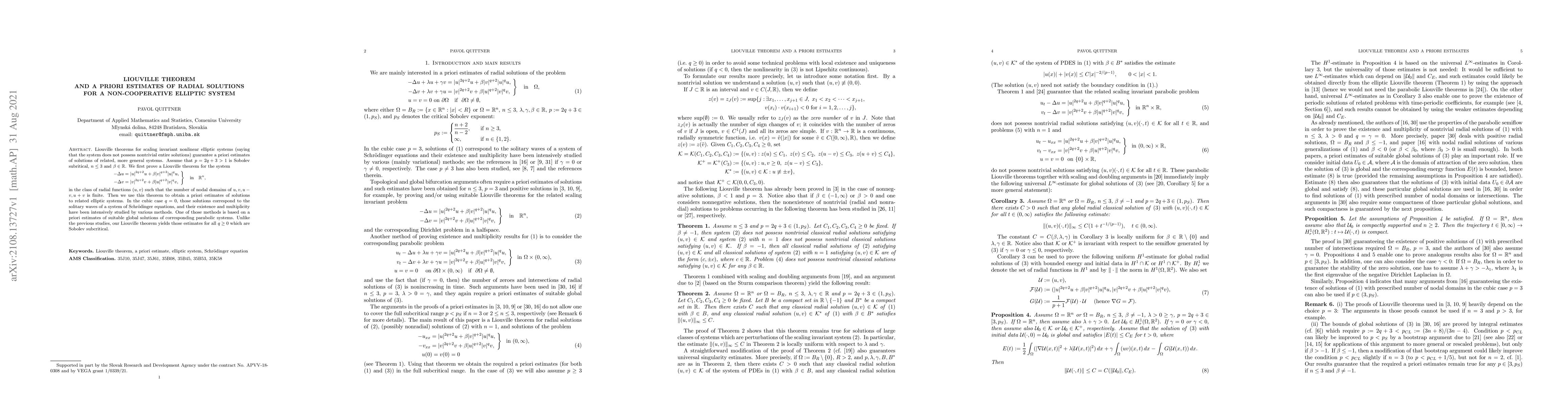 Liouville theorems for scaling invariant nonlinear elliptic systems (saying that the system does not possess nontrivial entire solutions) guarantee a priori estimates of solutions of related, more general systems. Assume that $p=2q+3>1$ is Sobolev subritical, $n\le3$ and $\beta\in{\mathbb R}$. We first prove a Liouville theorem for the system $$\left.\begin{aligned} -\Delta u &=|u|^{2q+2}u+\beta|v|^{q+2}|u|^q u, \\ -\Delta v &=|v|^{2q+2}v+\beta|u|^{q+2}|v|^q v, \end{aligned}\ \right\} \quad\hbox{in}\quad {\mathbb R}^n,$$ in the class of radial functions $(u,v)$ such that the number of nodal domains of $u,v,u-v,u+v$ is finite. Then we use this theorem to obtain a priori estimates of solutions to related elliptic systems. In the cubic case $q=0$, those solutions correspond to the solitary waves of a system of Schr\"odinger equations, and their existence and multiplicity have been intensively studied by various methods. One of those methods is based on a priori estimates of suitable global solutions of corresponding parabolic systems. Unlike the previous studies, our Liouville theorem yields those estimates for all $q\geq0$ which are Sobolev subcritical.