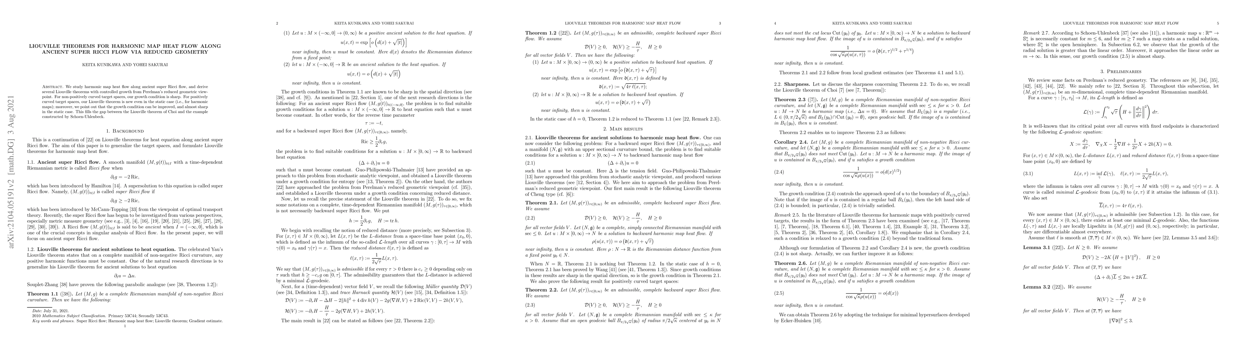 We study harmonic map heat flow along ancient super Ricci flow, and derive several Liouville theorems with controlled growth from Perelman's reduced geometric viewpoint. For non-positively curved target spaces, our growth condition is sharp. For positively curved target spaces, our Liouville theorem is new even in the static case (i.e., for harmonic maps); moreover, we point out that the growth condition can be improved, and almost sharp in the static case. This fills the gap between the Liouville theorem of Choi and the example constructed by Schoen-Uhlenbeck.