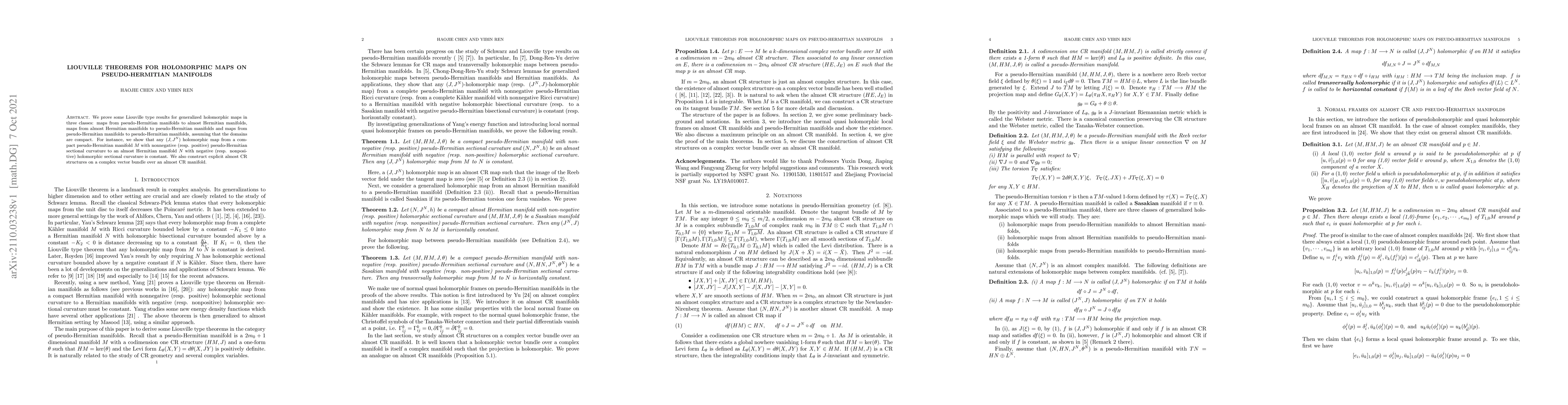 This paper proves Liouville theorems for holomorphic maps between pseudo-Hermitian and almost Hermitian manifolds, showing that certain compact holomorphic maps must be constant under specified curvature conditions. It also constructs explicit almost CR structures on complex vector bundles over almost CR manifolds.