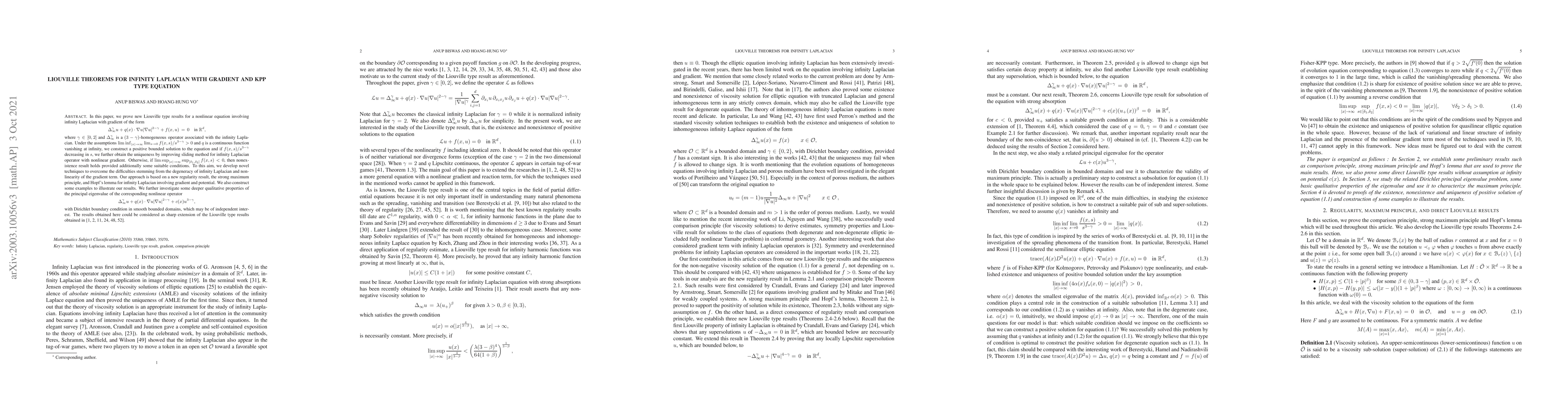 The paper proves new Liouville type results for a nonlinear equation involving infinity Laplacian with gradient, addressing nonexistence and uniqueness of positive bounded solutions under specific conditions.