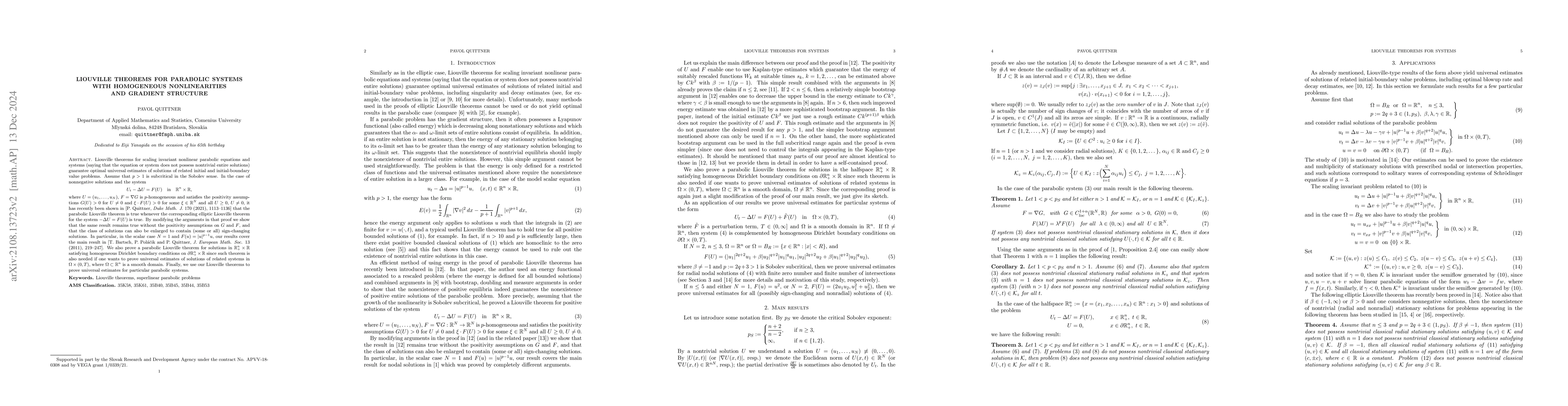 Liouville theorems for scaling invariant nonlinear parabolic equations and systems (saying that the equation or system does not possess nontrivial entire solutions) guarantee optimal universal estimates of solutions of related initial and initial-boundary value problems. Assume that $p>1$ is subcritical in the Sobolev sense. In the case of nonnegative solutions and the system $$U_t-\Delta U=F(U)\quad\hbox{in}\quad {\mathbb R}^n\times{\mathbb R},$$ where $U=(u_1,\dots,u_N)$, $F=\nabla G$ is $p$-homogeneous and satisfies the positivity assumptions $G(U)>0$ for $U\neq0$ and $\xi\cdot F(U)>0$ for some $\xi\in{\mathbb R}^N$ and all $U\geq0$, $U\ne 0$, it has recently been shown in [P. Quittner, Duke Math. J. 170 (2021), 1113-1136] that the parabolic Liouville theorem is true whenever the corresponding elliptic Liouville theorem for the system $-\Delta U=F(U)$ is true. By modifying the arguments in that proof we show that the same result remains true without the positivity assumptions on $G$ and $F$, and that the class of solutions can also be enlarged to contain (some or all) sign-changing solutions. In particular, in the scalar case $N=1$ and $F(u)=|u|^{p-1}u$, our results cover the main result in [T. Bartsch, P. Polacik and P. Quittner, J. European Math. Soc. 13 (2011), 219-247]. We also prove a parabolic Liouville theorem for solutions in ${\mathbb R}^n_+\times{\mathbb R}$ satisfying homogeneous Dirichlet boundary conditions on $\partial{\mathbb R}^n_+\times{\mathbb R}$ since such theorem is also needed if one wants to prove universal estimates of solutions of related systems in $\Omega\times(0,T)$, where $\Omega\subset{\mathbb R}^n$ is a smooth domain. Finally, we use our Liouville theorems to prove universal estimates for particular parabolic systems.