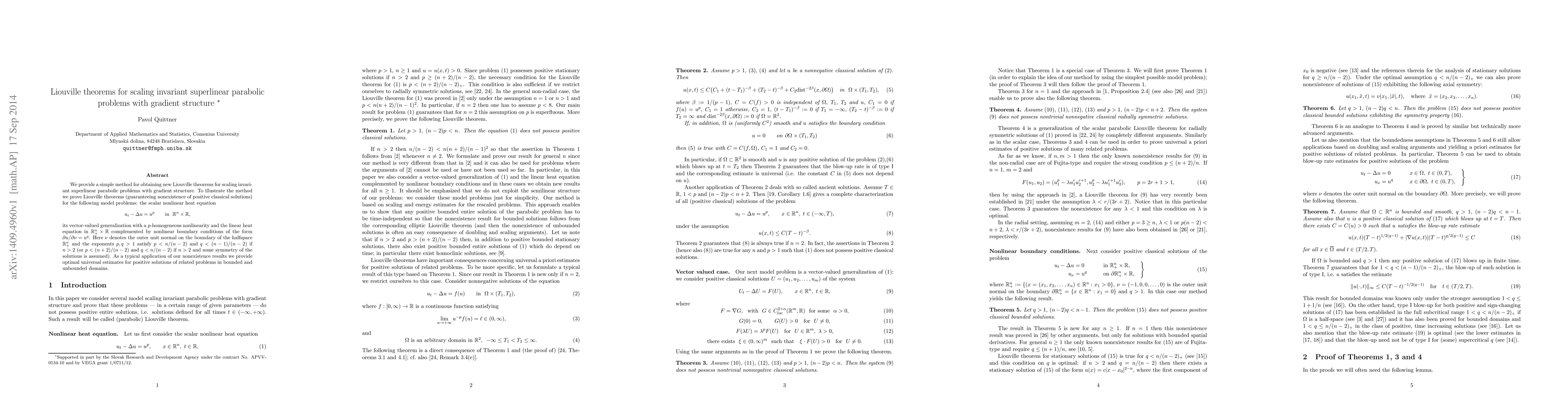 This paper presents a novel method for deriving Liouville theorems for scaling invariant superlinear parabolic problems featuring gradient structure, demonstrating nonexistence of positive classical solutions for specific model problems, including the scalar nonlinear heat equation and its vector-valued generalization. The method also provides optimal universal estimates for positive solutions in both bounded and unbounded domains.