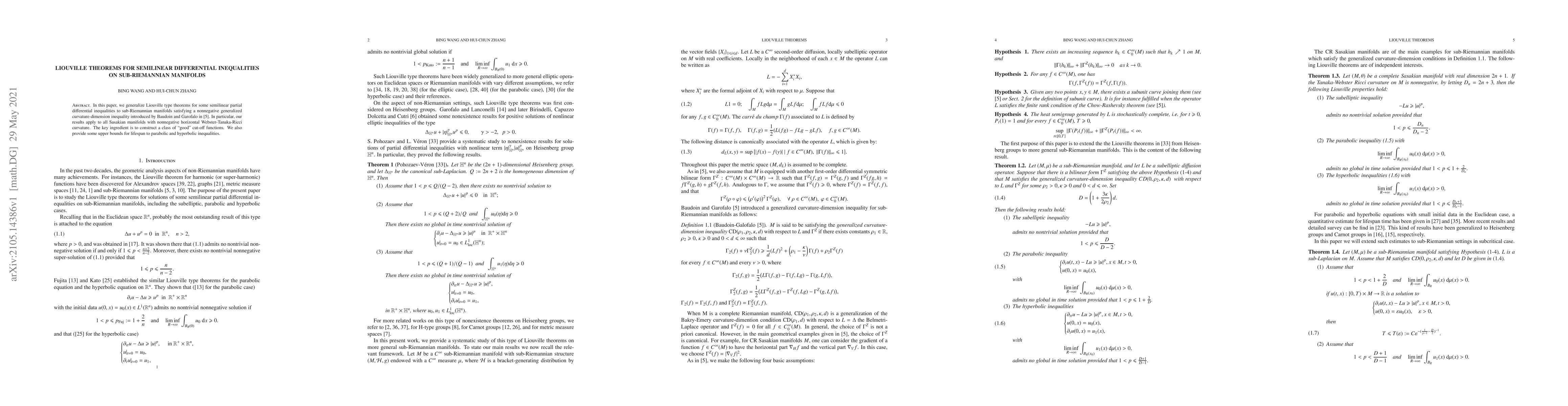 This paper generalizes Liouville theorems for semilinear differential inequalities to sub-Riemannian manifolds with nonnegative curvature-dimension conditions, focusing on Sasakian manifolds with nonnegative horizontal curvature. The key is the construction of "good" cut-off functions to derive the results.