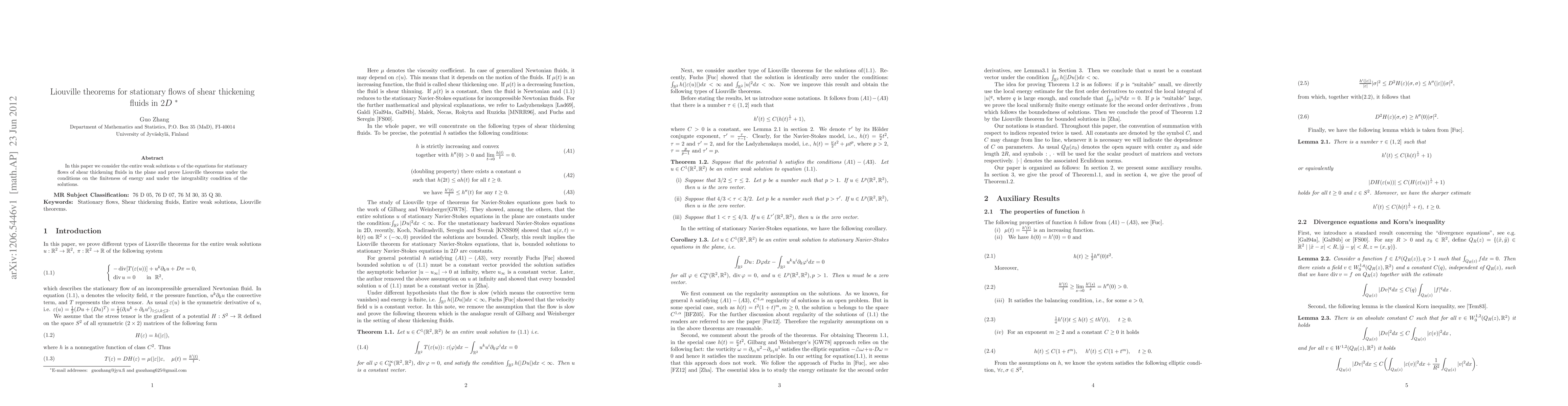 This paper proves Liouville theorems for entire weak solutions of stationary flows of shear thickening fluids in 2D, under conditions of finite energy and solution integrability. These results establish the uniqueness of such solutions under specified constraints.