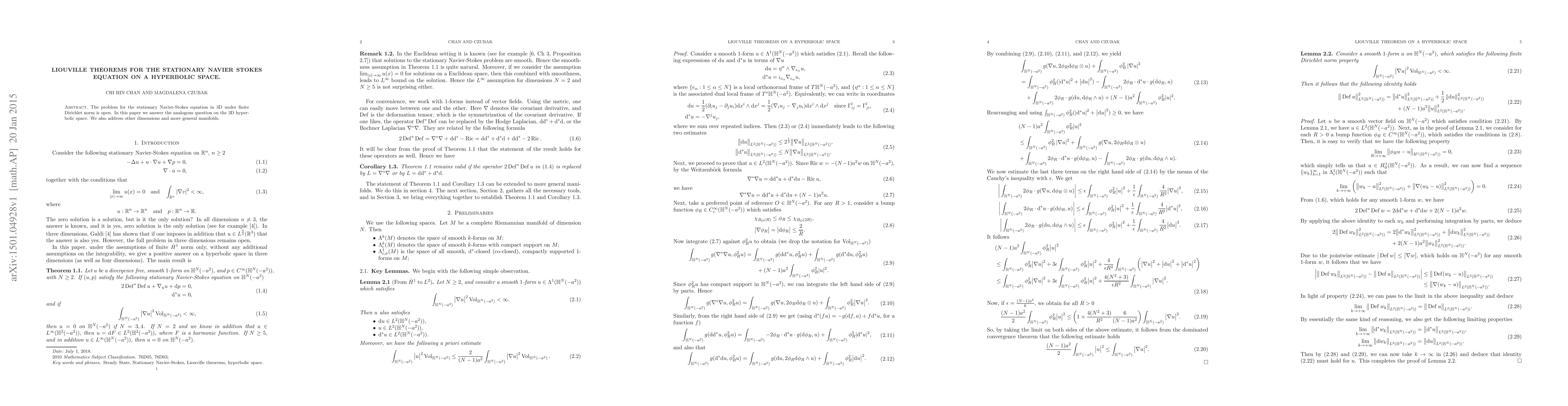 Summary: This paper investigates Liouville theorems for the stationary Navier-Stokes equation in 3D hyperbolic space, providing solutions to an open problem in fluid dynamics and extending the findings to other dimensions and general manifolds.