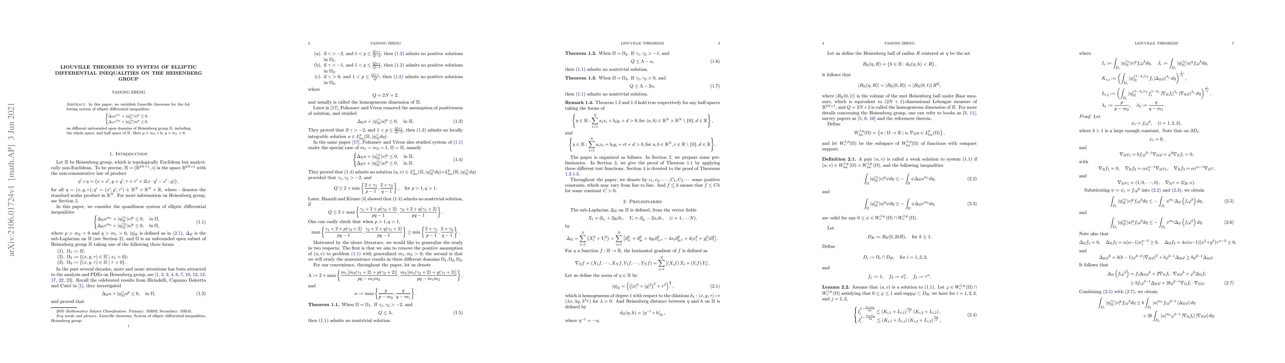 This paper establishes Liouville theorems for a system of elliptic differential inequalities on the Heisenberg group, demonstrating the behavior of solutions under specific conditions on different unbounded domains. The inequalities involve the sub-Laplacian operator and involve terms dependent on the variables \(u\) and \(v\).