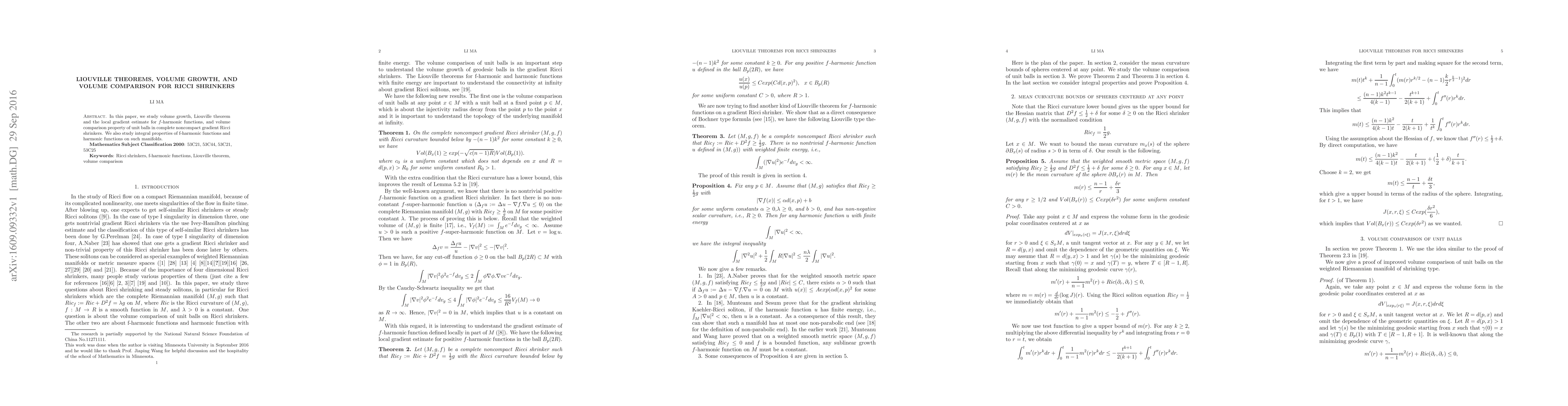 This paper investigates the volume growth, Liouville theorems, and volume comparison properties of complete noncompact gradient Ricci shrinkers, focusing on $f$-harmonic functions and their integral properties. It also explores local gradient estimates and the behavior of unit balls within these manifolds.