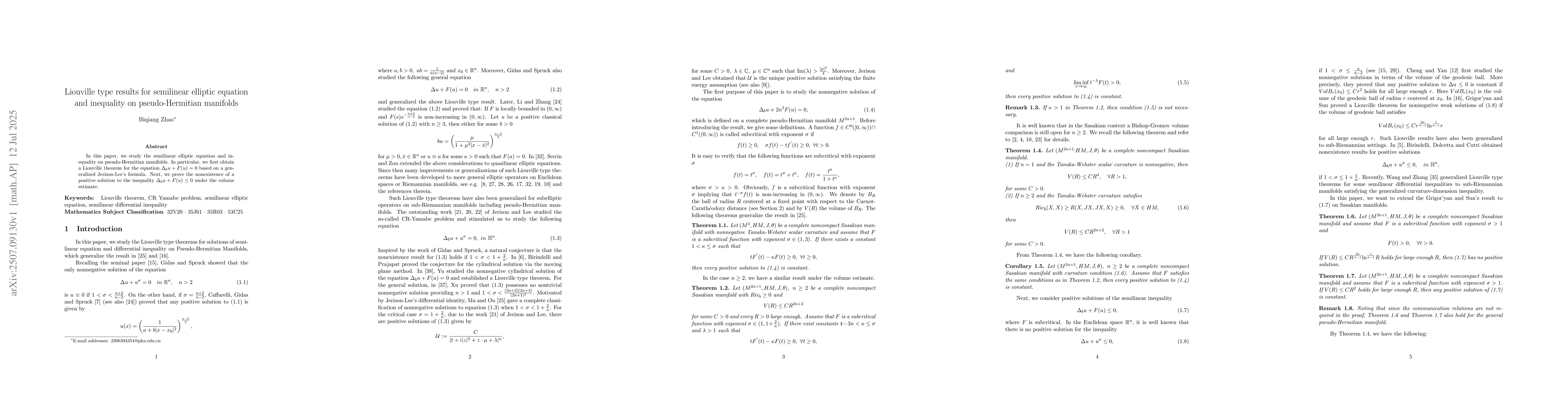 In this paper, we study the semilinear elliptic equation and inequality on pseudo-Hermitian manifolds. In particular, we first obtain a Liouville theorem for the equation $\Delta_b u+F(u)=0$ based on a generalized Jerison-Lee's formula. Next, we prove the nonexistence of a positive solution to the inequality $\Delta_b u+F(u)\leq 0$ under the volume estimate.