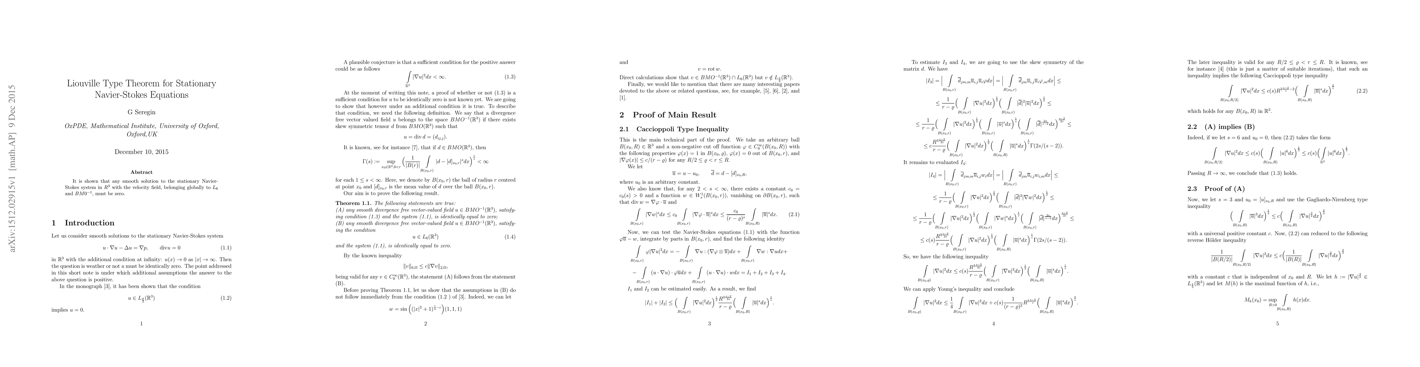 It is shown that any smooth solution to the stationary Navier-Stokes system in $R^3$ with the velocity field, belonging globally to $L_6$ and $BM0^{-1}$, must be zero.