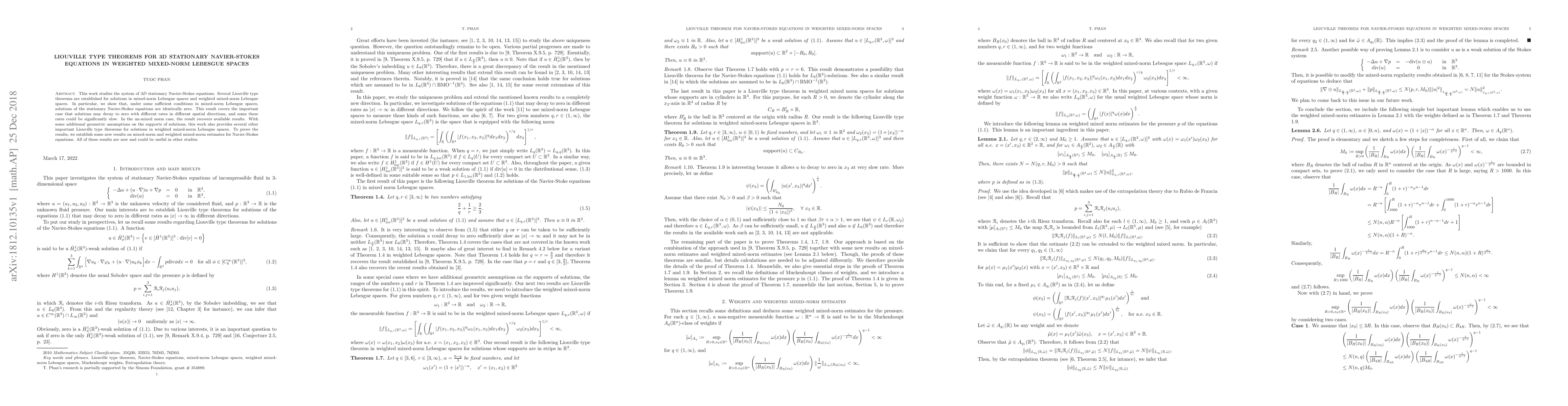 This work studies the system of $3D$ stationary Navier-Stokes equations. Several Liouville type theorems are established for solutions in mixed-norm Lebesgue spaces and weighted mixed-norm Lebesgue spaces. In particular, we show that, under some sufficient conditions in mixed-norm Lebesgue spaces, solutions of the stationary Navier-Stokes equations are identically zero. This result covers the important case that solutions may decay to zero with different rates in different spatial directions, and some these rates could be significantly slow. In the un-mixed norm case, the result recovers available results. With some additional geometric assumptions on the supports of solutions, this work also provides several other important Liouville type theorems for solutions in weighted mixed-norm Lebesgue spaces. To prove the results, we establish some new results on mixed-norm and weighted mixed-norm estimates for Navier-Stokes equations. All of these results are new and could be useful in other studies.