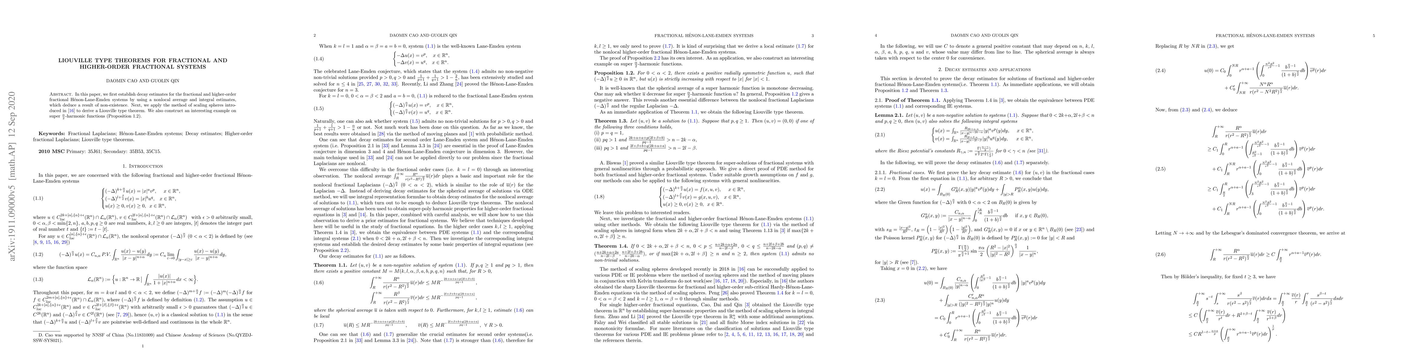 Summary: This paper establishes decay estimates for fractional and higher-order fractional Hénon-Lane-Emden systems, proving non-existence via nonlocal averages and integral techniques. A Liouville type theorem is derived using scaling spheres, and an example of super $\frac{\alpha}{2}$-harmonic functions is presented.