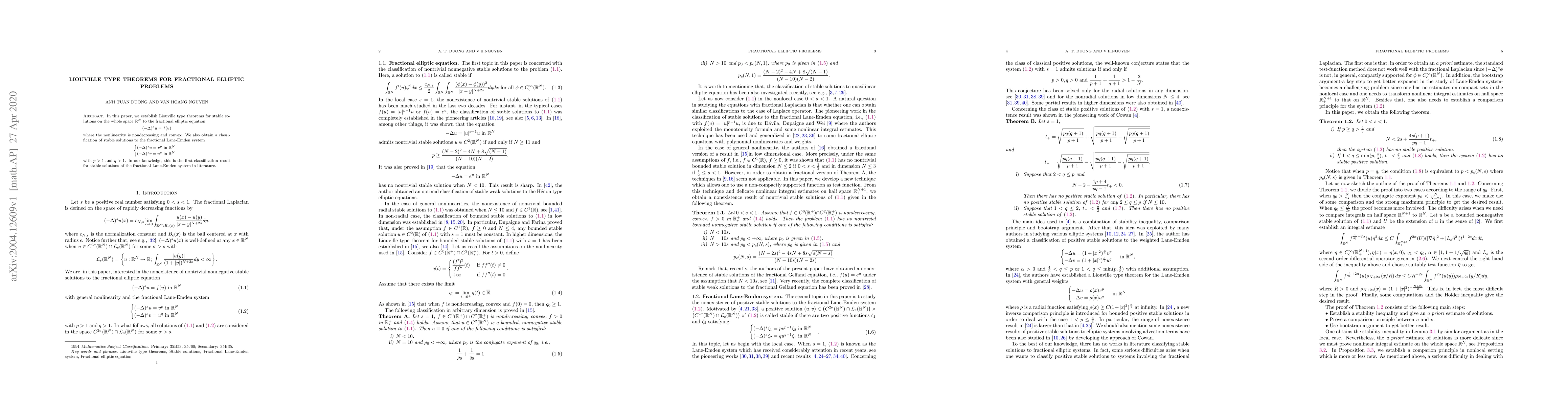 This paper establishes Liouville type theorems for stable solutions to fractional elliptic equations and provides the first classification result for stable solutions of the fractional Lane-Emden system in $\mathbb{R}^N$.