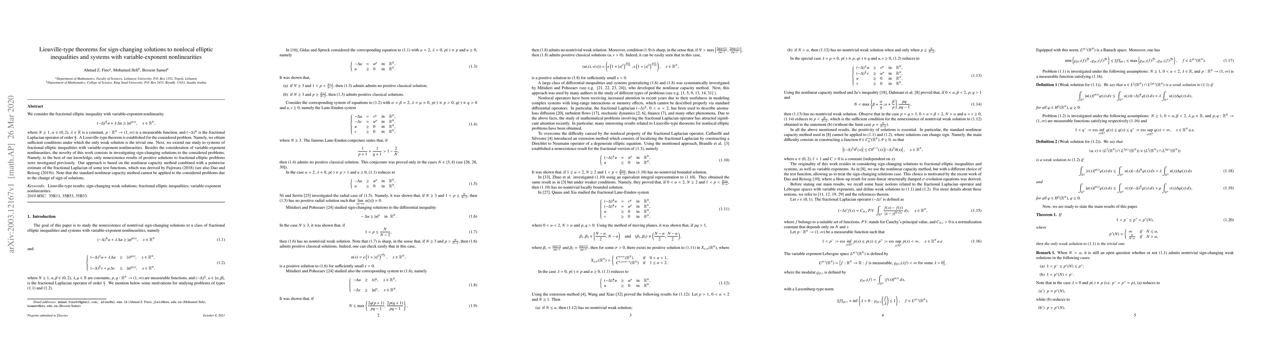 We consider the fractional elliptic inequality with variable-exponent nonlinearity $$ (-\Delta)^{\frac{\alpha}{2}} u+\lambda\, \Delta u \geq |u|^{p(x)}, \quad x\in\mathbb{R}^N, $$ where $N\geq 1$, $\alpha\in (0,2)$, $\lambda\in\mathbb{R}$ is a constant, $p: \mathbb{R}^N\to (1,\infty)$ is a measurable function, and $(-\Delta)^{\frac{\alpha}{2}}$ is the fractional Laplacian operator of order $\frac{\alpha}{2}$. A Liouville-type theorem is established for the considered problem. Namely, we obtain sufficient conditions under which the only weak solution is the trivial one. Next, we extend our study to systems of fractional elliptic inequalities with variable-exponent nonlinearities. Besides the consideration of variable-exponent nonlinearities, the novelty of this work consists in investigating sign-changing solutions to the considered problems. Namely, to the best of our knowledge, only nonexistence results of positive solutions to fractional elliptic problems were invetigated previously. Our approach is based on the nonlinear capacity method combined with a pointwise estimate of the fractional Laplacian of some test functions, which was derived by Fujiwara (2018) (see also Dao and Reissig (2019)). Note that the standard nonlinear capacity method cannot be applied to the considered problems due to the change of sign of solutions.