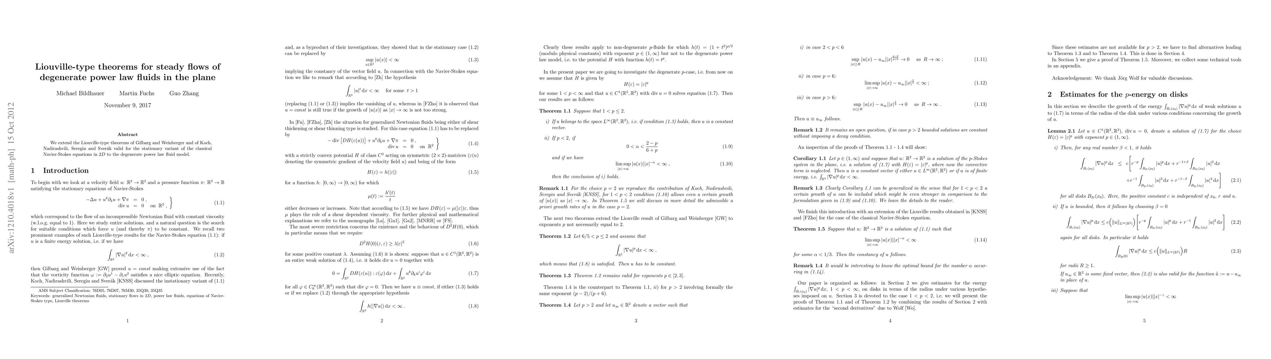 This research extends Liouville-type theorems to degenerate power law fluids in 2D, building on previous works by Gilbarg and Weinberger, and Koch, Nadirashvili, Seregin, and Sver'ak for Navier-Stokes equations, implying certain restrictions on the behavior of steady flows of these specific fluids.