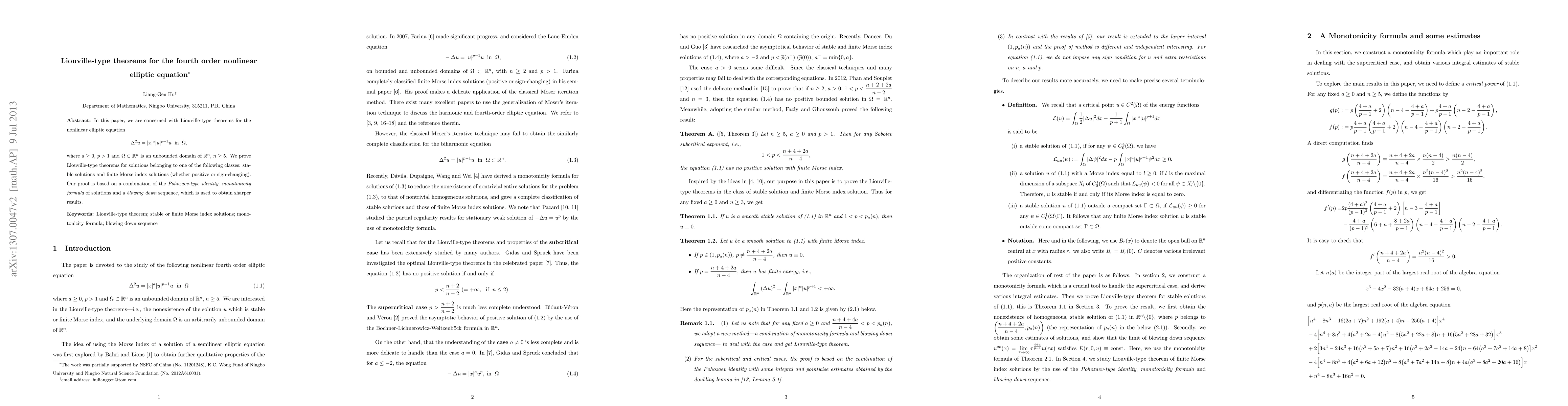 This paper explores Liouville-type theorems for solutions of the fourth-order nonlinear elliptic equation $\Delta^2 u=|x|^a |u|^{p-1}u$ in unbounded domains $\Omega \subset \mathbb{R}^n$ ($n \ge 5$). The authors prove results for stable and finite Morse index solutions, utilizing a combination of Pohozaev-type identities, monotonicity formulas, and blowing down sequences.