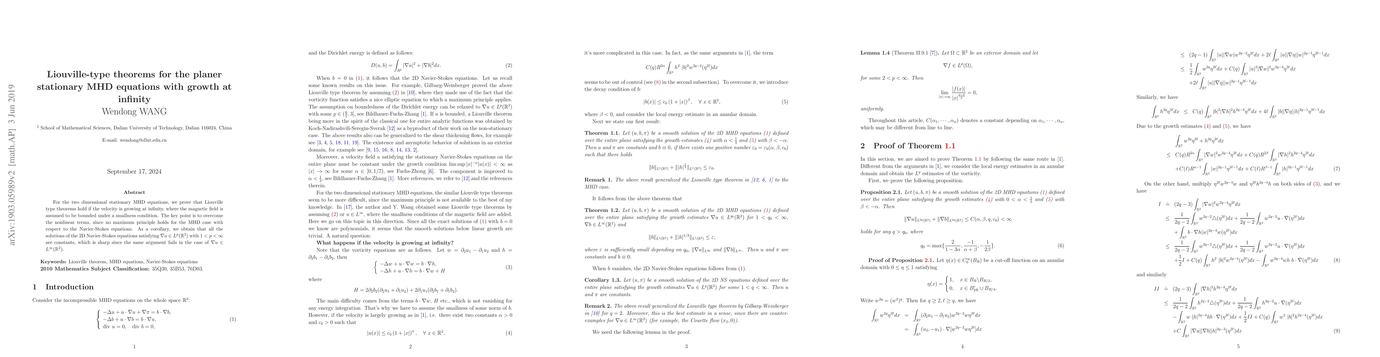 Summary: This paper proves Liouville-type theorems for the two-dimensional stationary MHD equations when the velocity grows at infinity, assuming a bounded magnetic field under a smallness condition. The study overcomes the challenges posed by nonlinear terms, as no maximum principle applies in this context.