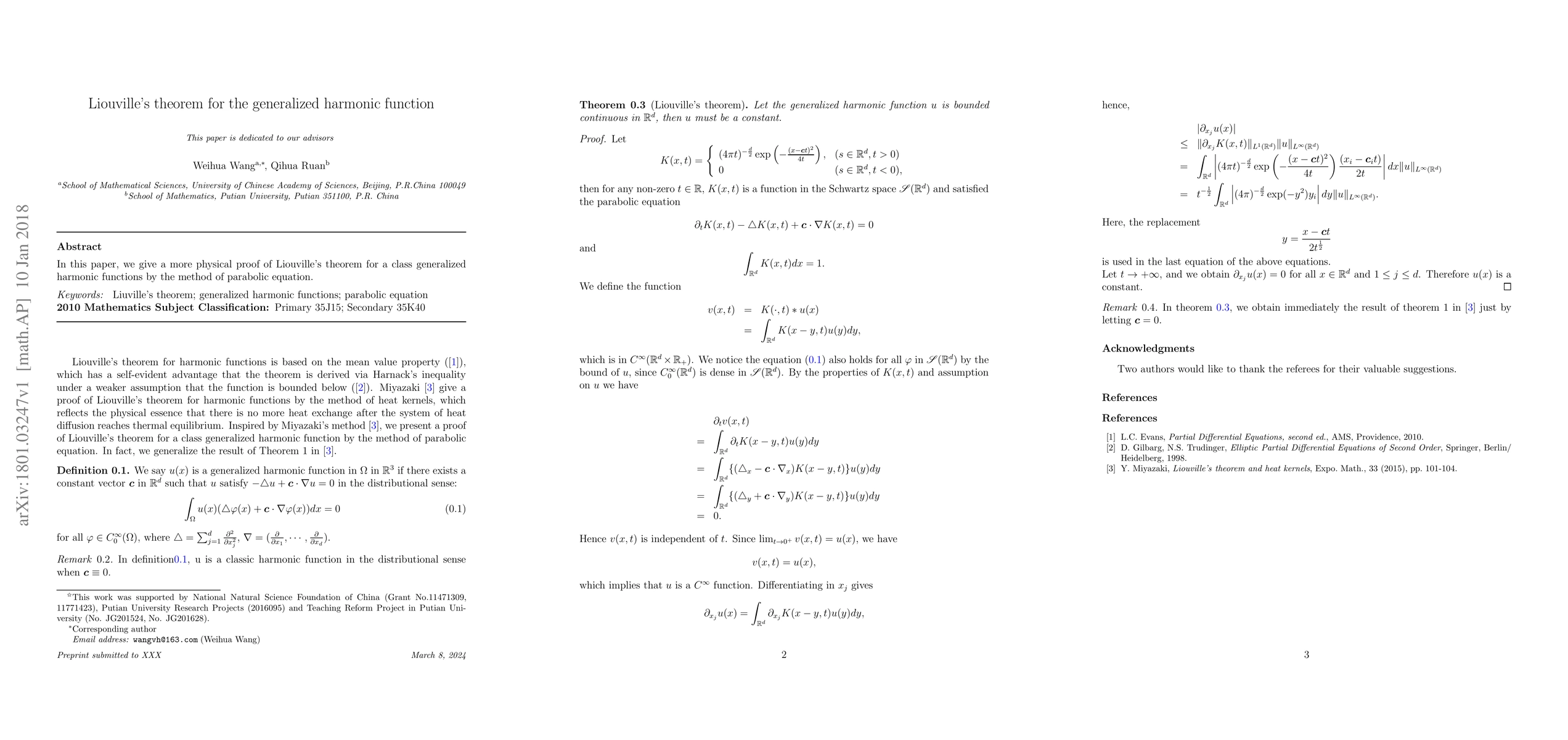 Summary: This paper presents a physical proof of Liouville's theorem for generalized harmonic functions using parabolic equation methods, enhancing the understanding of the behavior of these functions.