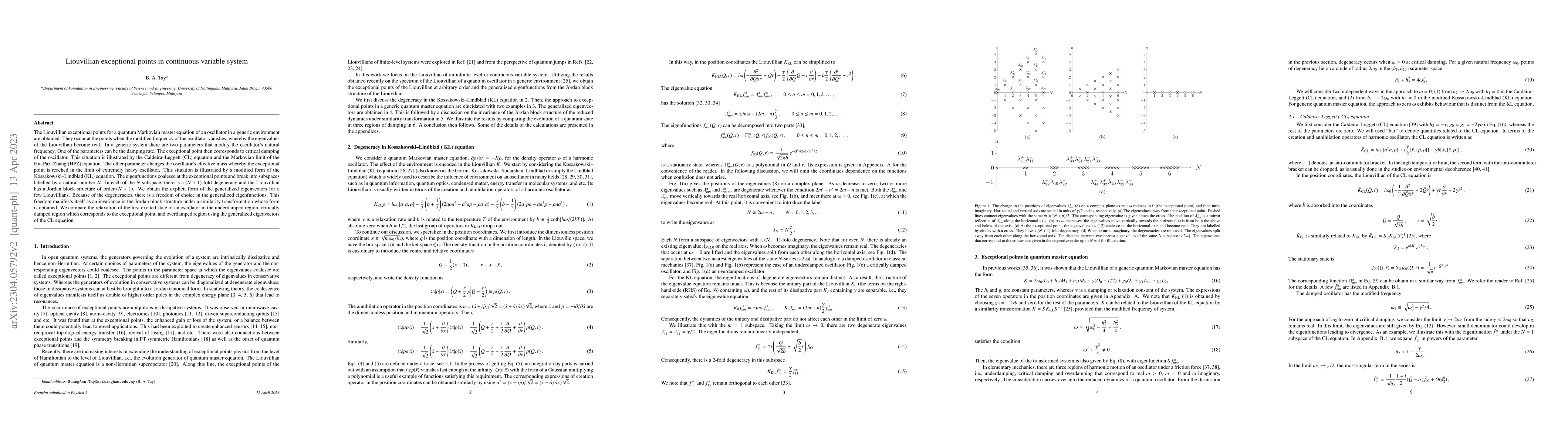 This paper investigates Liouvillian exceptional points in quantum systems, specifically for an oscillator in a generic environment, where these points occur when the modified frequency of the oscillator vanishes. The study reveals that exceptional points correspond to critical damping or extremely heavy oscillators, and they exhibit a Jordan block structure and $(N+1)$-fold degeneracy in the eigenfunctions.