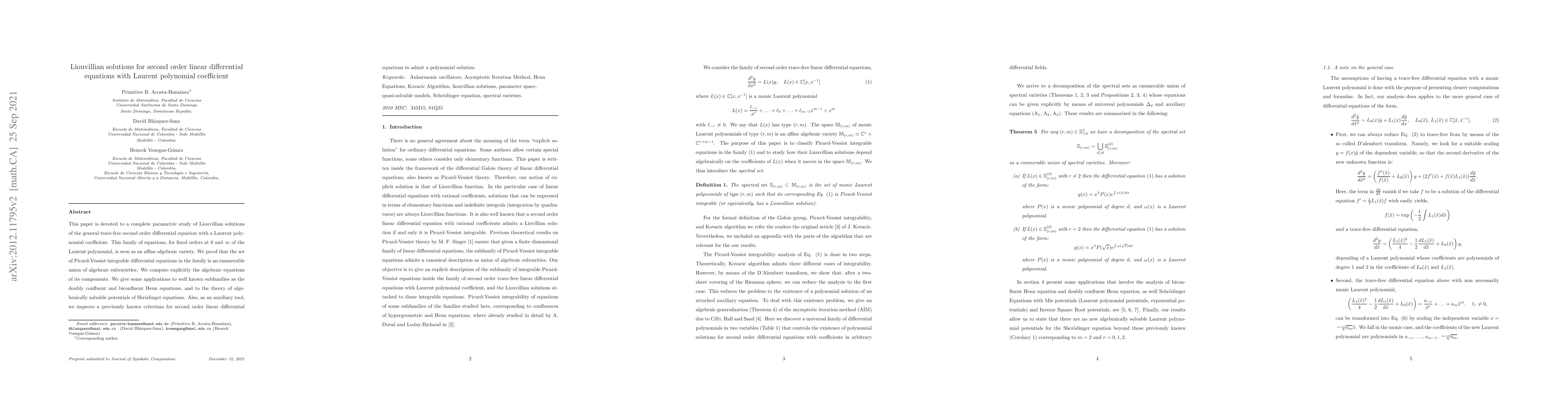 This paper is devoted to a complete parametric study of Liouvillian solutions of the general trace-free second order differential equation with a Laurent polynomial coefficient. This family of equations, for fixed orders at $0$ and $\infty$ of the Laurent polynomial, is seen as an affine algebraic variety. We proof that the set of Picard-Vessiot integrable differential equations in the family is an enumerable union of algebraic subvarieties. We compute explicitly the algebraic equations of its components. We give some applications to well known subfamilies as the doubly confluent and biconfluent Heun equations, and to the theory of algebraically solvable potentials of Shr\"odinger equations. Also, as an auxiliary tool, we improve a previously known criterium for second order linear differential equations to admit a polynomial solution.