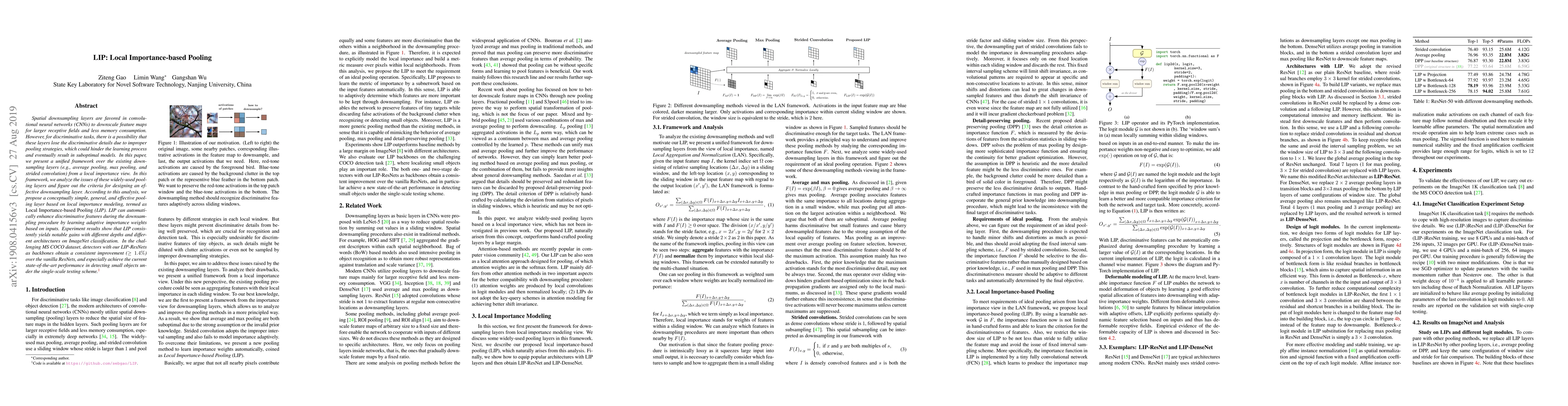 The paper introduces Local Importance-based Pooling (LIP), a novel pooling layer that enhances discriminative features by learning adaptive importance weights, improving CNN performance on tasks like ImageNet classification and MS COCO object detection, especially for small objects. LIP outperforms traditional pooling methods by preserving critical details during downsampling.
